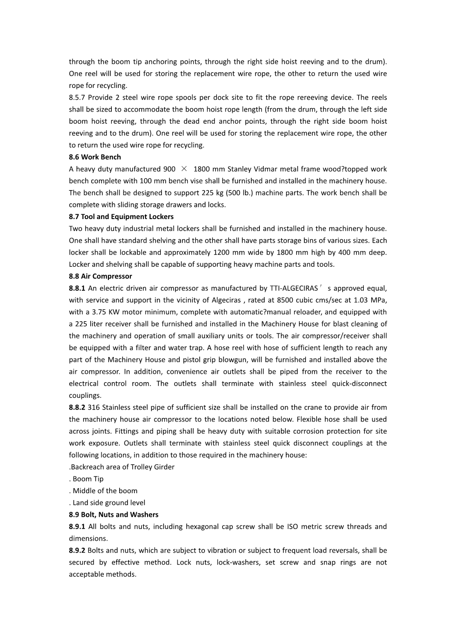 8.4.3如果可以通过布局和随后的现场演示证明,机械房服务起重机可以接触到所有部件,则主小车机械可由机械房起重机进行操作。8.4.4根据采购要求,应在人字架顶部和起重臂上提供起重臂结构,用于拆卸起重臂起重机滑轮。