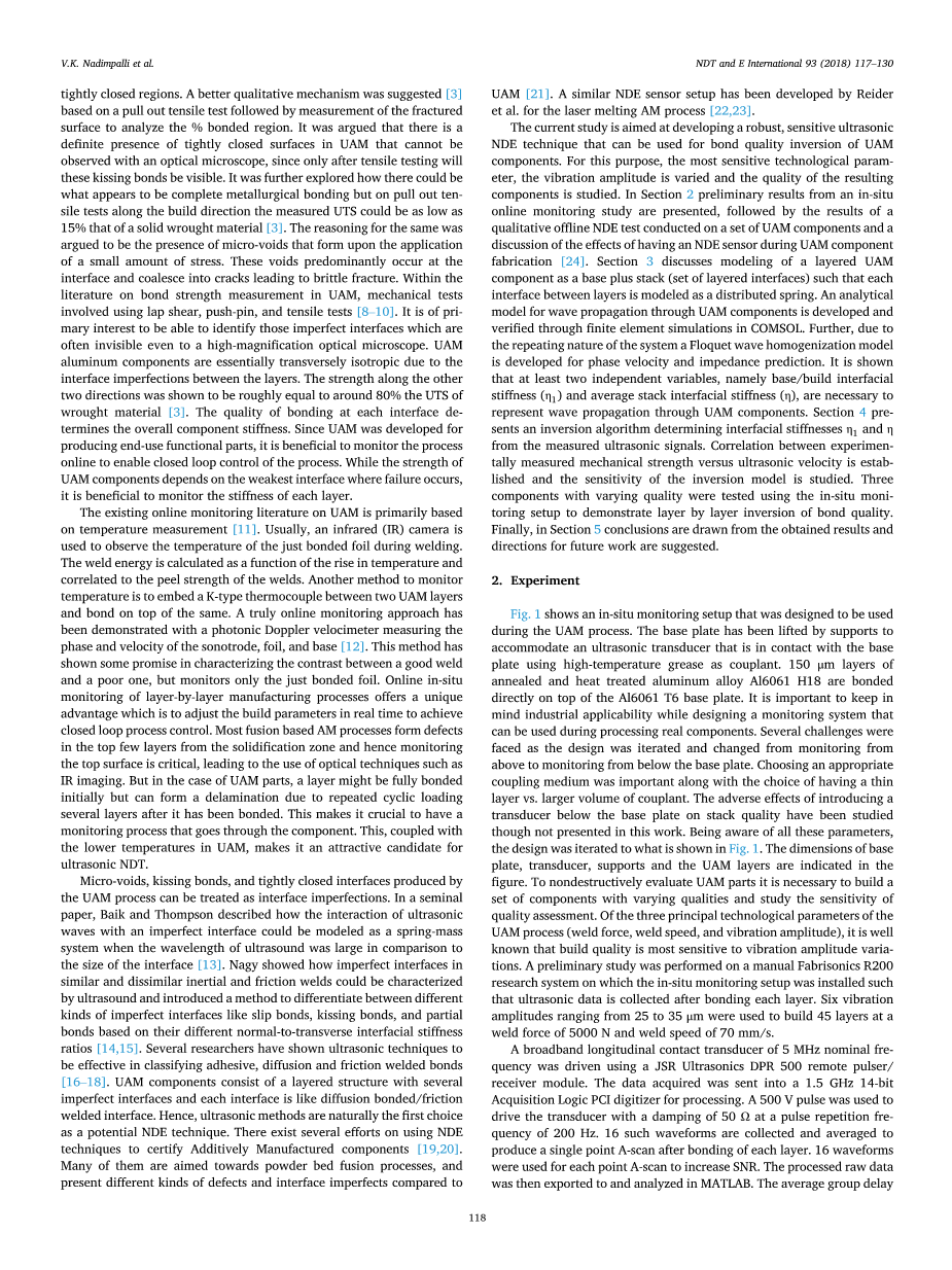 本研究的目的是开发一种稳健、灵敏的超声无损检测技术,可用于UAM成分的粘接质量反演。为了这个目的,最敏感的技术参数,振动振幅是变化的,并得到的组件的质量进行了研究。在第2节中,给出了现场在线监测研究的初步结果,随后是在一组UAM组件上进行的定性离线NDE测试的结果,以及在UAM部件制造过程中具有NDE传感器的效果的讨论[24 ]。第3节讨论了分层UAM组件作为基础加栈(一组分层接口)的建模,使得各层之间的接口被建模为分布式弹簧。通过在COMSOL中的有限元模拟,开发并分析了通过UAM组件的波传播的解析模型。此外,由于系统的重复性质,Floquet波均匀化模型被开发用于相速度和阻抗预测。结果表明,至少有两个独立的变量,即基础/建造界面刚度(ε1)和平均叠层界面刚度(ETA)是代表波通过UAM分量传播的必要参数。第4节提出了一种从测得的超声信号中确定界面刚度ε1和ε的反演算法。建立了实验测得的机械强度与超声速度之间的相关性,并研究了反演模型的灵敏度。使用现场监测装置测试了三种具有不同质量的部件,以证明粘结质量的逐层反演。最后,在第5节中得出的结论得到的结果和未来的工作方向提出了建议。
