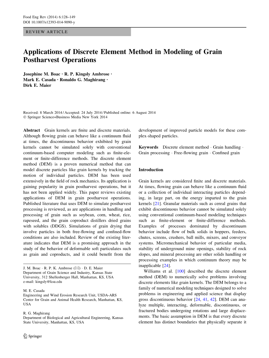 离散元法(DEM),由于其在预测各种过程中的实际情况具有较好的特性,在谷物和食品加工中的应用越来越广泛。然而,与采矿和化学工业领域不同,由于谷物和食品的生物来源所产生的各种颗粒性质问题,DEM并没有得到广泛的应用。本文的目的是回顾现有的使用 (DEM)作为粮食采后处理和加工的数值模拟技术的研究成果。本文的研究范围仅限于DEM在粮食及其副产品中的应用。