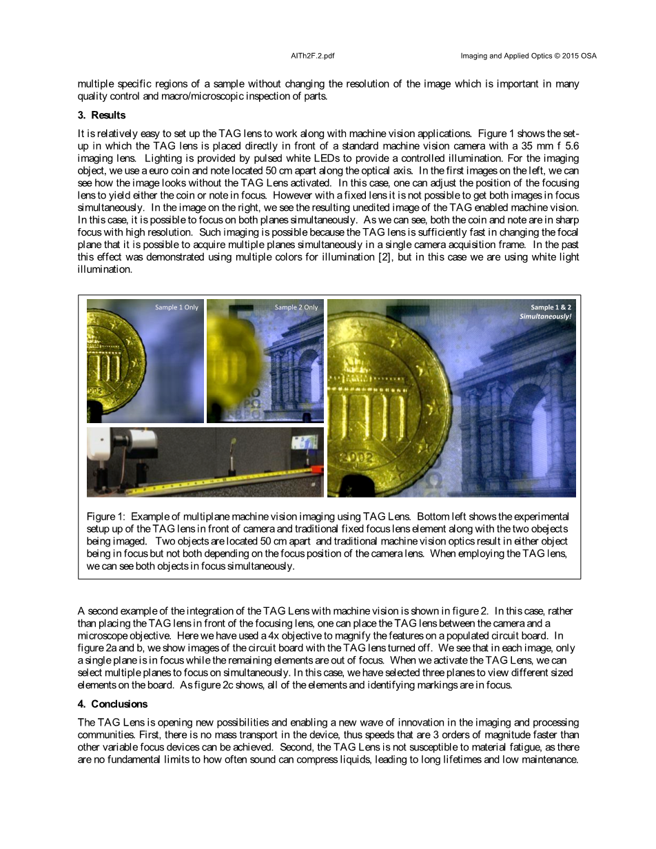 在这种情况下,TAG镜头与机器视觉集成的第二个例子如图2所示,而不是将TAG镜头放在聚焦镜头前面, 人们可以将TAG镜头放置在相机和显微镜目标之间。在这里,我们使用 4x的物镜来放大填充电路板上的特征。在图 2a 和 b 中,我们显示了TAG镜头关闭时电路板的图像。我们看到,在每个图像中,只有一个平面处于焦点位置,而其余元素处于焦点之外。当我们激活TAG镜头时,我们可以选择多个平面同时对焦。在这种情况下,我们选择了三个平面来查看板上不同尺寸的元素。如图 2c 所示,所有的元素和识别标记都处于焦点位置。