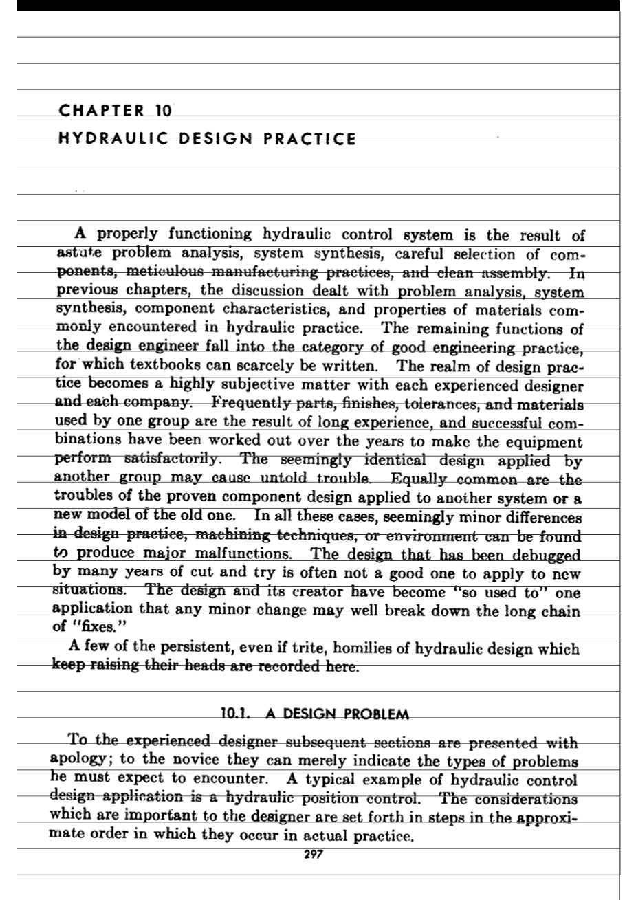 一个正常运行的液压控制系统是敏锐的问题分析、系统综合、仔细选择部件、细致的制造实践和清洁装配的结果。在前几章中,讨论了在液压实践中常见的问题分析、系统综合、部件特性和材料特性。设计工程师的其他功能属于良好的工程实践范畴,教科书几乎无法为之编写。对于每一位有经验的设计师和每一家公司来说,设计实践领域成为一个高度主观的问题。通常,一个组使用的部件、饰面、公差和材料都是长期经验的结果,多年来已经成功地组合在一起,使设备性能令人满意。另一个小组所采用的看似相同的设计可能会造成难以言喻的麻烦。同样常见的问题是,经过验证的组件设计应用于另一个系统或旧系统的新模型。在所有这些情况下,设计实践、加工技术或环境上看似微小的差异都可能导致严重的故障。经过多年反复调试的设计通常不适用于新情况。设计和它的创建者已经成为一个“如此习惯”的应用程序,任何微小的更改都可能打破“修复”的长链。