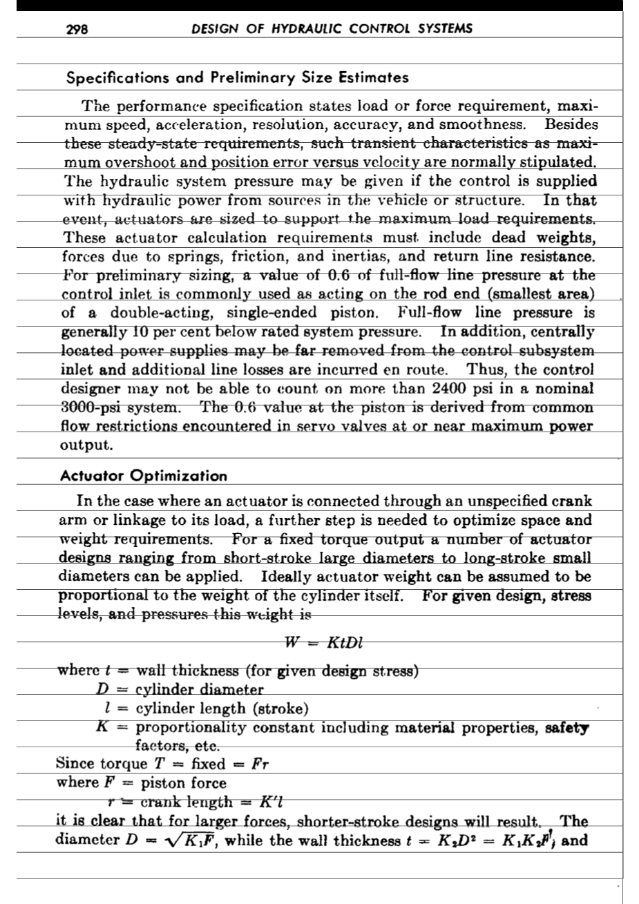 性能规格说明说明了负载或力的要求、最大速度、加速度、分辨率、精度和平滑度。除了这些稳态要求外,通常还规定了诸如最大超调和位置误差随速度变化等瞬态特性。如果控制装置由车辆或结构中的液压源提供液压动力,则液压系统压力可以给定。在这种情况下,执行机构的尺寸应满足最大负载要求。这些执行机构的计算要求必须包括自重、弹簧产生的力、摩擦力、惯性和回线阻力。对于预施胶,控制入口的全流线压力值0.6通常作用于双作用单端活塞的杆端(最小面积)。全流线压力通常比额定系统压力低10%。此外,位于中心位置的电源可能远离控制子系统入口,并在线路上产生额外的线路损耗。因此,控制设计者可能不能指望超过2400 psi在一个标称的3000 psi系统。活塞处的0.6值来自于伺服阀在最大输出功率或接近最大输出功率时遇到的常见流量限制。