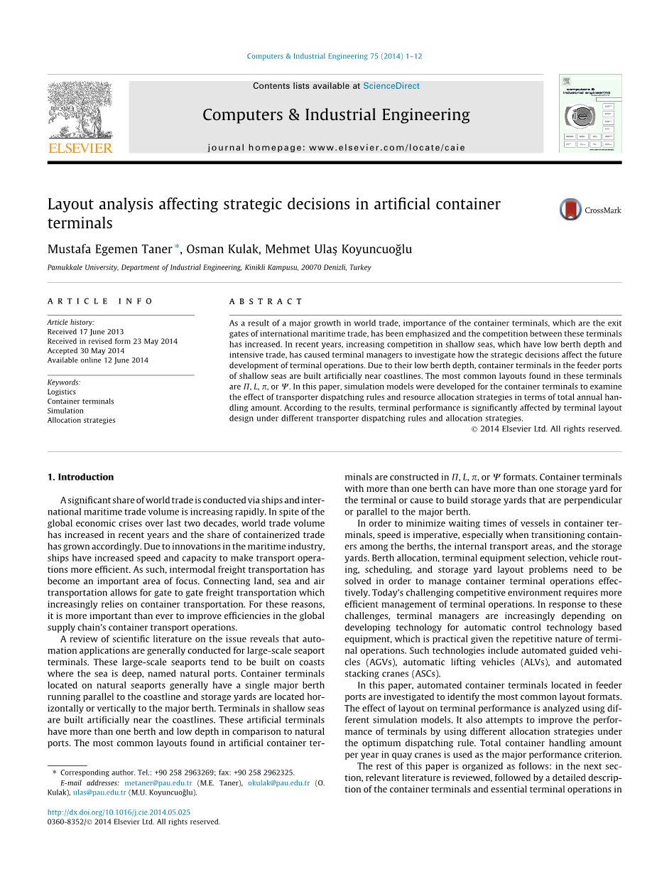 Abstract:As a result of a major growth in world trade, importance of the container terminals, which are the exit gates of international maritime trade, has been emphasized and the competition between these terminals has increased. In recent years, increasing competition in shallow seas, which have low berth depth and intensive trade, has caused terminal managers to investigate how the strategic decisions affect the future development of terminal operations. Due to their low berth depth, container terminals in the feeder ports of shallow seas are built artificially near coastlines. The most common layouts found in these terminals are P, L, p, or W. In this paper, simulation models were developed for the container terminals to examine the effect of transporter dispatching rules and resource allocation strategies in terms of total annual handling amount. According to the results, terminal performance is significantly affected by terminal layout design under different transporter dispatching rules and allocation strategies.