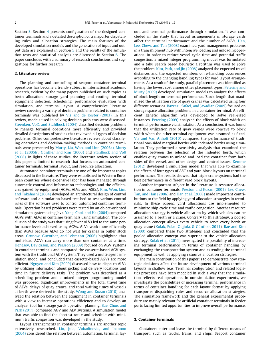 自动化集装箱码头是文献中讨论的重要课题之一。它们建立在西欧国家,那里昂贵的劳动力通过自动控制和信息技术以及设备(agv、alv和ASCs)所获得的效率来管理。Kim,Win,Lim和Takahashi(2004年)开发了一个控制软件的体系结构设计和一个基于仿真的试验台来测试各种控制规则的软件用于控制自动化集装箱码头。在一个面向对象的仿真系统中,利用Java语言对基于操作的问题进行了测试。Yang,Choi和Ha(2004)对集装箱码头AGV与ALV进行了仿真比较。这项研究的结论是,使用较少的ALVs可以达到相同的性能水平。ALV的工作效率比AGV高,因为ALV不等待起重机在缓冲库存区域。Grunow,Guenther和Lehmann(2006年)强调多载AGV一次可以装载多个集装箱。Henesey、Davidsson和Persson(2009)重点研究了集装箱码头的AGV系统,并与传统的AGV系统进行了比较。他们使用了一个多智能体仿真模型,并得出结论,基于磁带的AGV的效率更高。Nguyen和Kim(2009年)讨论如何在未来交付任务中利用有关收件和交货位置以及时间的信息来分派ALV。该问题被描述为一个调度问题,并提出了一个混合整数规划模型。研究得出了ALV的总行驶时间、码头起重机的延误和船舶在泊位的总等待时间均有显著改善。Wong和Kozan(2010年)分析了集装箱码头设备之间的关系,以期提高作业效率,并开发出一种用于堆场作业规划的分析工具。BAE、Choe和Park(2011年)比较了AGV和ALV系统。在此基础上,建立了一个具有最小交通拥堵度的最短路径和最短调度的仿真模型。