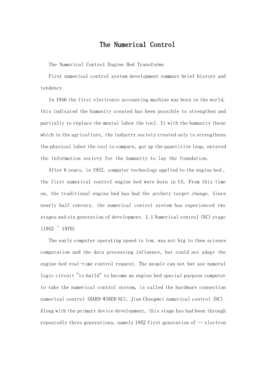 早期计算机的运算速度低,对当时的科学计算和数据处理影响还不大,但不能适应机床实时控制的要求。人们不得不采用数字逻辑电路'搭'成一台机床专用计算机作为数控系统,被称为硬件连接数控(HARD-WIRED NC),简称为数控(NC)。随着元器件的发展,这个阶段历经了三代,即1952年的第一代--电子管;1959年的第二代--晶体管;1965年的第三代--小规模集成电路。