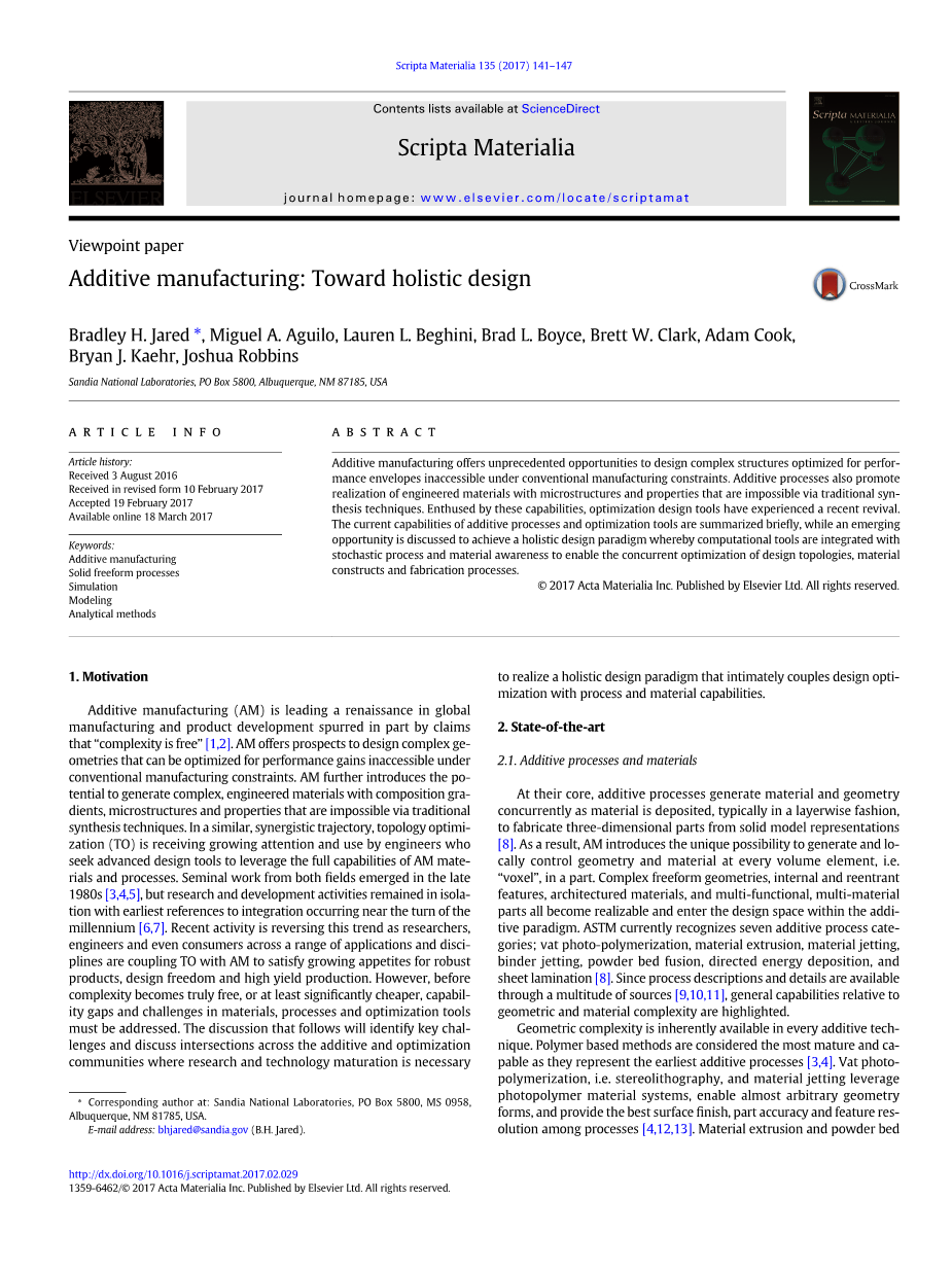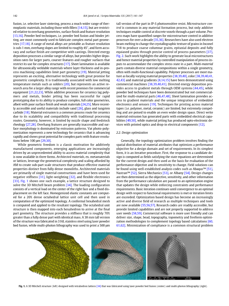 增材制造为设计复杂结构提供了前所未有的机会,使这些复杂结构在常规制造约束条件下难以达到的性能范围内优化。增材制造工艺也促进了工程材料的实现,其具有通过传统合成技术不可能的微结构和性质。通过这些能力,优化设计工具已经经历了最近的复兴。目前加法工艺和优化工具的能力被简要总结,同时讨论了一个新兴机会——以实现一个整体设计范例,由此计算工具与随机过程和材料意识实现设计拓扑、材料结构和制造工艺的并行优化。