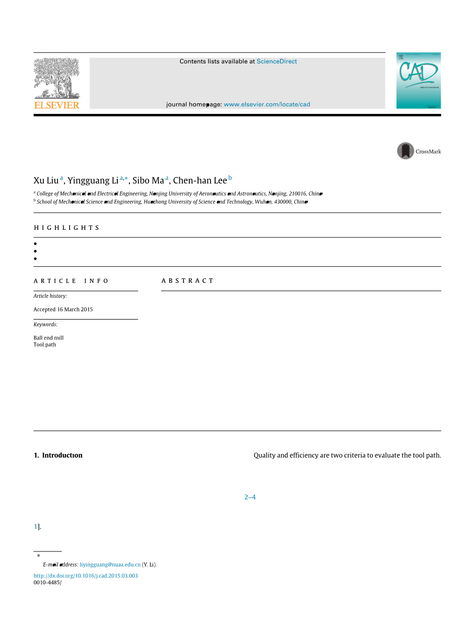 有效切割形状(ECS)被定义为刀具表面的近似值,通过计算偏移表面和ECS之间的交点来查找加工条宽度[5]。 但是,这种近似可能会导致不必要的碰撞。 Yoon等人。 [6]使用刀具表面的Dupin标记和接触点处的设计表面来找出局部可铣削的切割位置。 然后应用加工带宽度的二阶近似值生成切割方向的最佳切割位置。 有效刀具半径(ECR)是描述ECS的核心属性。 为了克服基于数值方法和几何近似的传统ECR计算中灵活性和耗时较少的不足,Redonnet等 [7]提出了授权分析计算圆环面铣刀ECR的关系。 他们还得出结论认为,ECR的增加直接改善了加工带材的宽度。 为了以更一般的方式扩展这一结论,加工带宽度的增加是由ECR的接近度和表面法线曲率的增加引起的。 Jensen等人。 [8]提出了五轴曲率匹配加工的刀具选择方法。 加工条宽度通过ECR和表面曲率来评估。 Lu等人 [9]也使用曲率匹配方法来近似加工带宽最大化的尖端高度。 建立3D配置空间以确保切刀无凿孔,并且尖端高度小于加工公差。 Gong etal给出了一种新的工具位置优化方法,通过最小化工具包络表面和设计表面之间的相对法向曲率来最大化加工带宽度。 Anotaipaiboon和Makhanov利用自适应空间填充曲线(SFC)的概念来生成刀具路径。 两个等参数刀具路径将首先重叠,然后通过遵循具有最佳加工带宽度的方向自适应生成SFC,以从现有等参数刀具路径构建刀具路径。 但是,等参数刀具路径通常不遵循局部最优加工方向,加工带宽度最大,特别是对于复杂曲面。 法德和冯[3,11]将加工带宽的最大化作为工具定向确定的优化目标。 他们的研究表明,虽然最小曲率方向大多不是最佳在自由曲面加工方向上,最小曲率方向确实表示CC点处的最佳进给方向的良好近似,特别是对于相对于切割器尺寸具有低曲率的自由曲面。 同样,范和球提出了一种在二次曲面上进行平面铣刀铣削刀具定向优化的方法。
