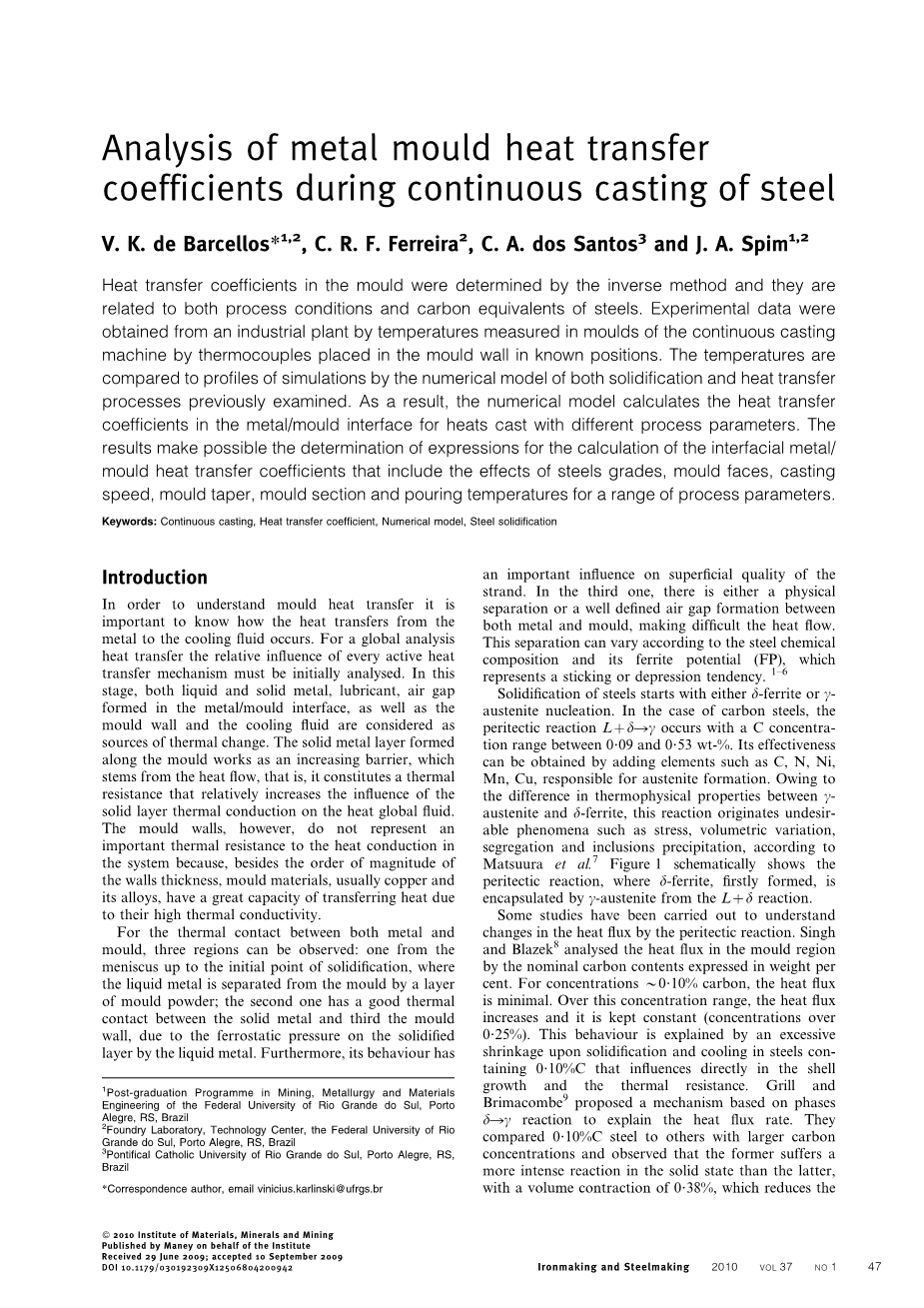 对于金属和模具之间的热接触,可以观察到三个区域:一个从弯月面到初始凝固点,其中液态金属通过一层模铸粉末与模具分离; 由于液态金属在固化层上的静态压力,第二个在固体金属和第三个模壁之间具有良好的热接触。 此外,它的行为对链的表面质量有重要影响。 在第三种情况下,金属和模具之间存在物理分离或形成明确的气隙,使得热流难以进行。 这种分离可以根据钢的化学成分及其铁素体电位(FP)而变化,这代表了粘附或抑制趋势。 1-6