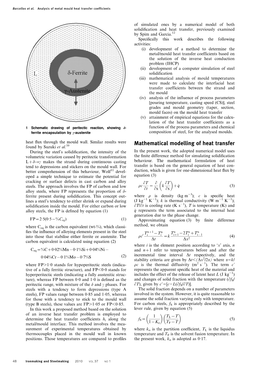其中i是根据#39;x#39;轴的元素位置,n和nz1分别指增量时间间隔Dt之前和之后的温度,稳定性标准由Dt给出,Dtlt;(Dx2 / 2a)其中a5k / rc是热扩散系数(m2/s-1)。 术语c#39;表示材料的表观比热,包括释放潜热L(J kg21)和固体分数随温度变化(LfS / LT)的影响,由c95 [c2L(LfS / LT )]。 固体部分取决于系统中涉及的许多参数。 但是,假定固体部分仅随温度变化是相当合理的。 对于碳钢,fS由杠杆法则适当描述,由等式给出