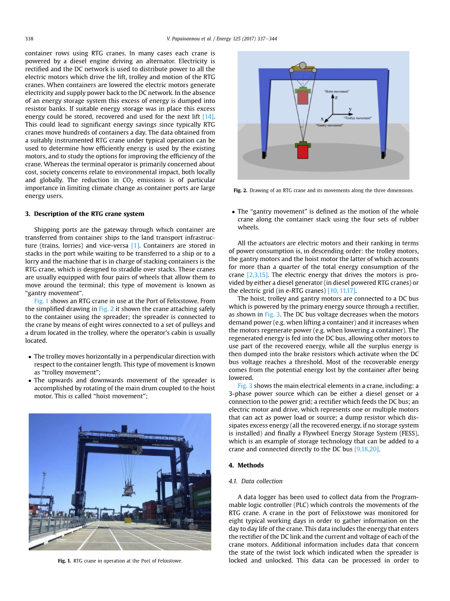 集装箱港口消耗大量能量来运输许多集装箱。每个集装箱可以通过降低起升高度来回收惯性能量。在由电网供电的集装箱起重机中,回收的能量可以在同一台起重机上重复使用,放回电网或在港口的其他地方使用。在轮胎式起重机(RTG起重机)中,能量通常不会被回收,而是会在转储电阻中消耗掉。 当RTG采用柴油驱动时,一年通常消耗超过120,000升柴油[21]。根据费利克斯托港的情况,大型港口可能会有多达100台RTG起重机,这些起重机将消耗数百万升柴油,排放数千公斤的二氧化碳。 但是这种能量可以被起重机回收,用于提升下一个集装箱。 因此必须为RTG起重机设计合适和高效的储能系统,并了解其正常工作周期下的能量使用情况。