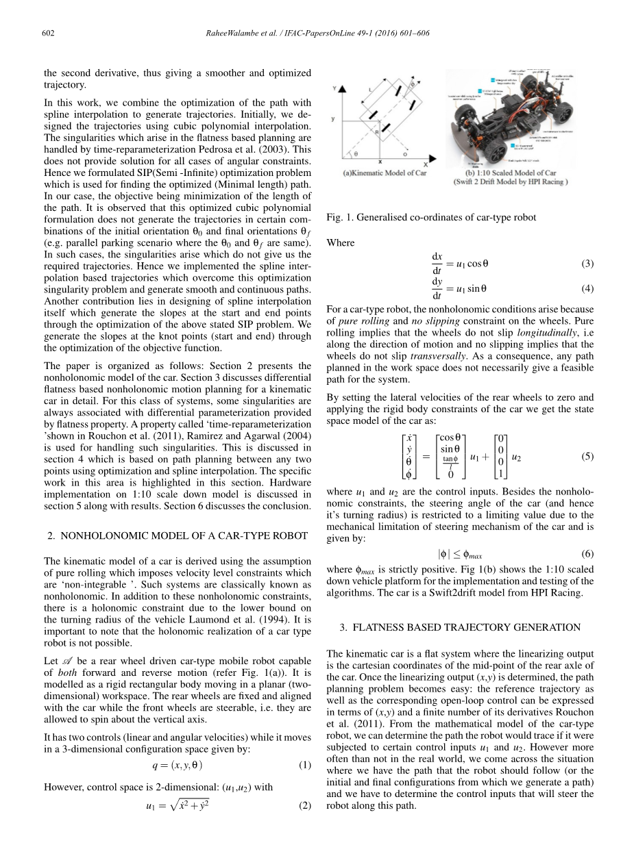 论文的组织如下:第2节给出了汽车的非完整模型。第三节讨论了基于微分平坦的非完整运动规划的详细运动车。对于这类系统,一些奇异性总是与微分平坦属性提供的参数化。在罗琼等人(2011)、拉米雷斯和阿嘎沃尔(2004)中所示的一种叫做“时间-参数化”的属性用于处理这种奇异性。在第4节中讨论了使用优化和样条插值来实现两点之间的路径规划。这一领域的具体工作在这一节中突出显示。在第5节中讨论了硬件实现,以及结果。第六节讨论结论。