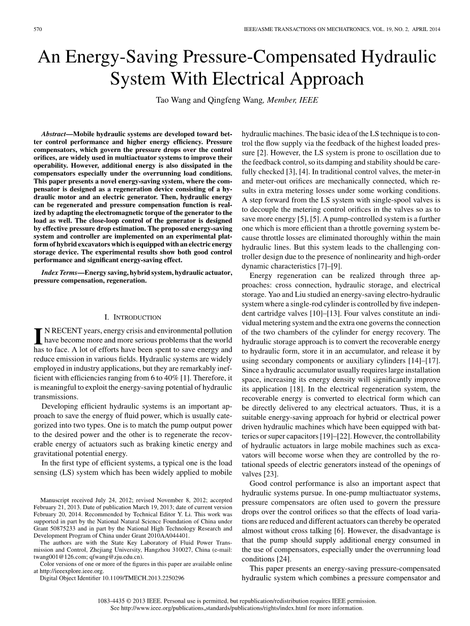 关键词:节能,混合动力系统,液压执行器,压力补偿,再生。