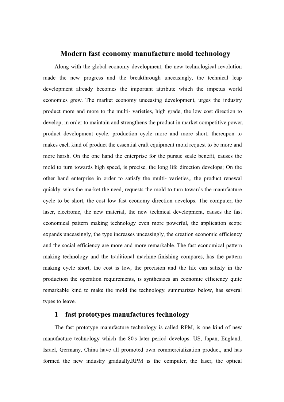 随着全球经济的发展,新的技术革命不断取得新的进展和突破,技术的飞跃发展已经成为推动世界经济增长的重要因素。市场经济的不断发展,促使工业产 品越来越向多品种、小批量、高质量、低成本的方向发展,为了保持和加强产品在市场上的竞争力,产品的开发周期、生产周期越来越短,于是对制造各种产品的关键工艺装备——模具的要求越来越苛刻。 一方面企业为追求规模效益,使得模具向着高速、精密、长寿命方向发展;另一方面企业为了满足多品种、小批量、产品更新换代快、赢得市场的需要,要求模具向着制造周期短、成本低的快速经济的方向发展。计算机、激光、电子、新材料、新技术的发展,使得快速经济制模技术如虎添翼,应用范围不断扩大,类型不断增多,创造的经济效益和社会效益越来越显著。 快速经济制模技术与传统的机械加工相比,具有制模周期短、成本低、精度与寿命又能满足生产上的使用要求,是综合经济效益比较显著的一类制造模具的技术,概括起来,有以下几种类别。