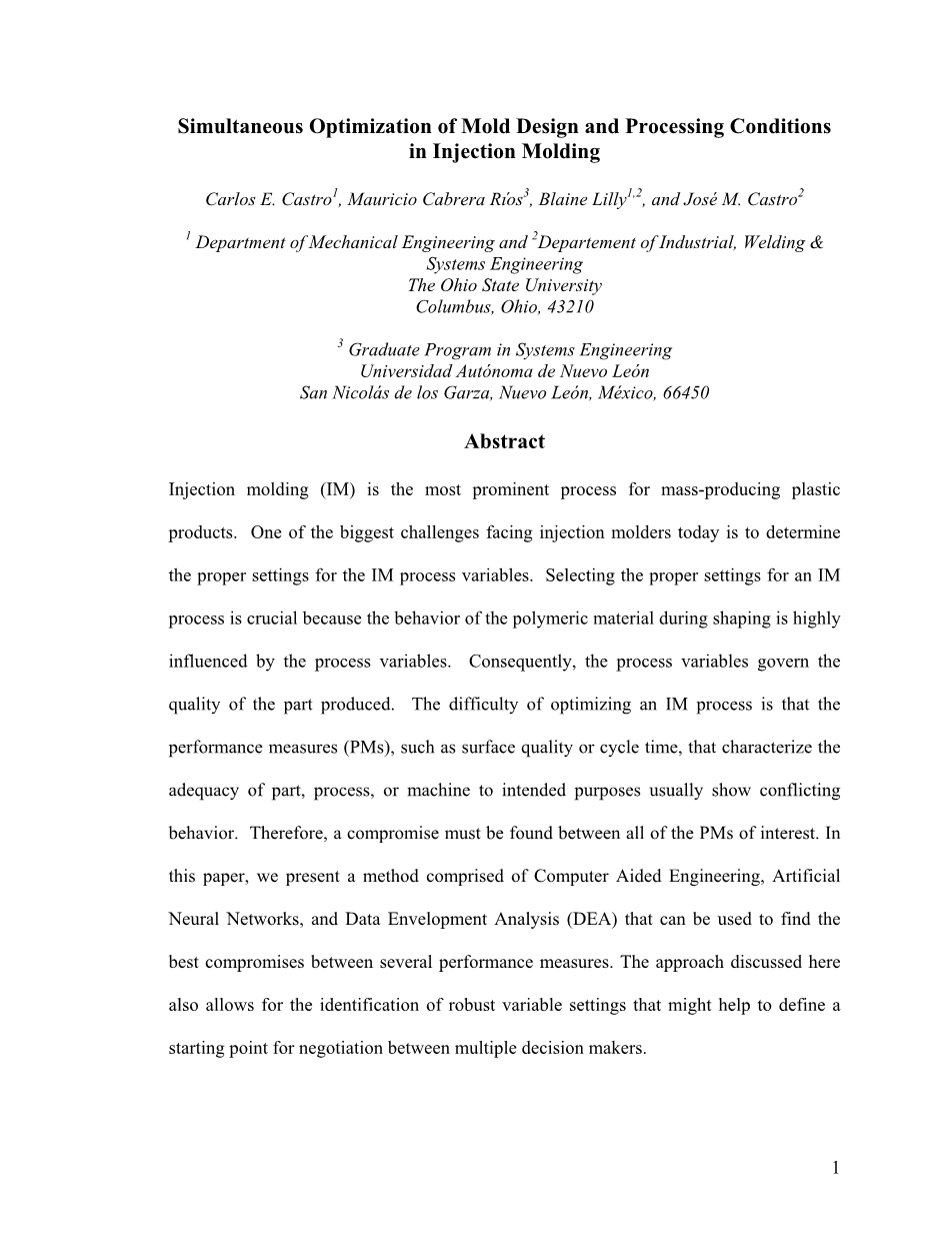 注塑成型(IM)是大规模生产塑料制品最杰出的过程。今天注射模塑所面临的一个最大的挑战就是确定注塑工艺变量的适当设置。给一个注塑成型过程选择合适的设置是至关重要的,因为聚合物材料在成型过程中的反应受工艺变量的影响很大。因此,工艺变量控制着生产零件的质量。优化注塑过程的难点在于性能指标(PMs),如表面质量、周期,零件的特征适当或机器到预期目的通常表现出的冲突状态。因此,必须在所有利害相关的性能指标间折中。在本文中,我们提出了一个由计算机辅助工程,人工神经网络,数据包络分析(DEA)组成的方法,它可以使找到的几个性能指标比较折中。这里所讨论的方法还允许强大变量设置的识别,这可能有助于定义一个多决策者协商的起点。