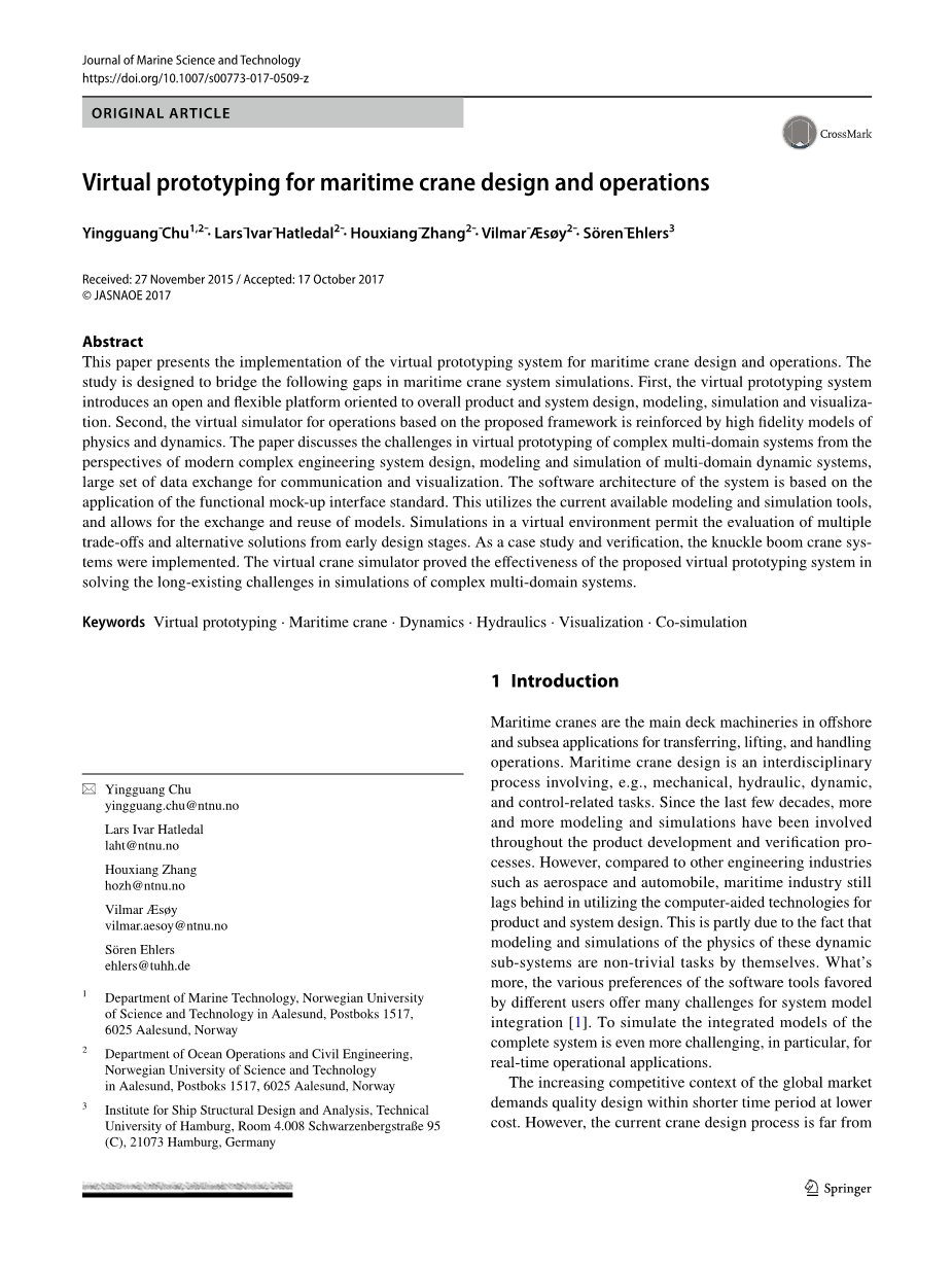 本文介绍了海上起重机虚拟样机系统的设计和操作是如何实现的。本研究旨在将海上起重机系统仿真中的下列特点联系起来。首先,虚拟样机系统引入了一个面向所有产品和系统设计、建模、仿真及可视化的开放、灵活的平台。其次,建立在拟议框架上的可用于操作的虚拟仿真器由于有高保真度的物理和力学模型而得到增强。本文从现代复杂工程系统设计、多域动态系统建模与仿真、大规模数据交换通信和可视化技术等方面论述了复杂多域系统内虚拟样机技术所面临的挑战。该系统的软件体系结构是建立在功能仿真接口标准的应用上的。它利用了当前可用的建模和仿真工具,并可以实现模型的交换和重复使用。在虚拟环境下进行的仿真可以对早期设计阶段的多种折衷方案和替代解决方案进行评估。转向节臂起重机系统作为其案例研究和取证得以实施。虚拟起重机仿真器证明了该虚拟样机系统在解决复杂多域系统仿真中长期存在的困难这一方面是有效的。