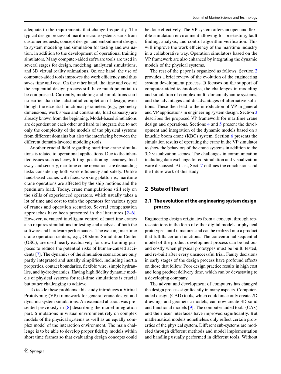 论文的其余部分组织如下。第2节简要回顾了该工程系统开发过程的演变过程。这一部分重点研究了计算机辅助技术的支持、复杂多域动态系统建模与仿真的挑战以及替代解决方案的优缺点。紧接着会阐述在工程系统设计中的VP的总体介绍和VP的实际应用。 第3节描述了海上起重机设计和操作的VP框架。第4节和第5节介绍了基于转向节臂起重机(KBC)系统的动态模型的设计和集成。第6节给出了在VP仿真器中运行起重机的仿真结果,以显示起重机系统在三维可视化场景之外的行为。讨论中出现的困难包括数据交换的协同仿真和可视化软件的讨论。最后,第7节概述了本研究的结论和今后工作的展望。
