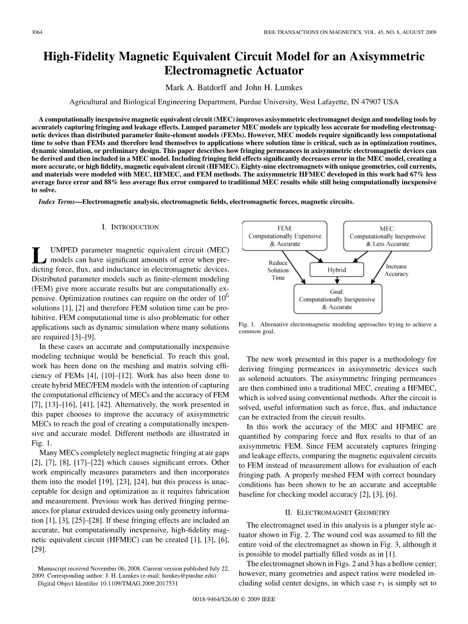 一种计算简化的磁性等效电路(MEC)通过精确捕获边缘和泄漏效应来改善轴对称电磁体设计和建模工具。与分布式参数有限元模型(FEM)相比,集中参数MEC模型对于建模电磁设备通常较不准确。然而,与FEM相比,MEC模型需要的计算时间明显更少,因此适用于解决时间非常关键的应用,例如优化例程,动态模拟或初步设计。本文描述了如何导出轴对称电磁装置中的边缘磁导,然后将其纳入MEC模型。包括边缘场效应可显着降低MEC模型中的误差,从而创建更精确或高保真的磁性等效电路(HFMEC)。使用MEC,HFMEC和FEM方法对具有独特几何形状,线圈电流和材料的89个电磁体进行建模。在这项工作中开发的轴对称HFMEC与传统的MEC结果相比,平均力误差减少了67%,平均通量误差减少了88%,但仍然在计算上花费不多。
