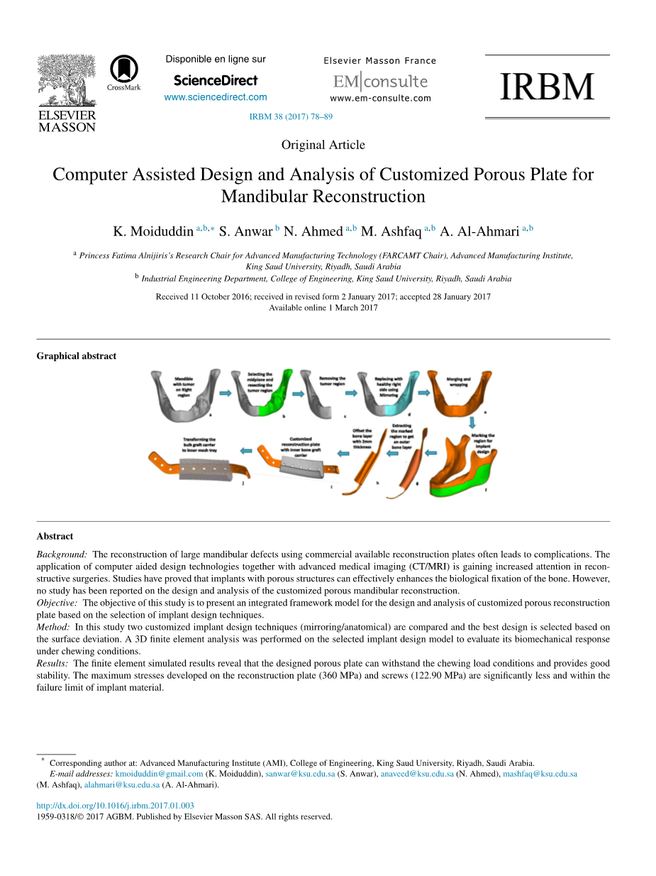 K. Moiduddin a,b,lowast; S. Anwar b N. Ahmed a,b M. Ashfaq a,b A. Al-Ahmari a,b