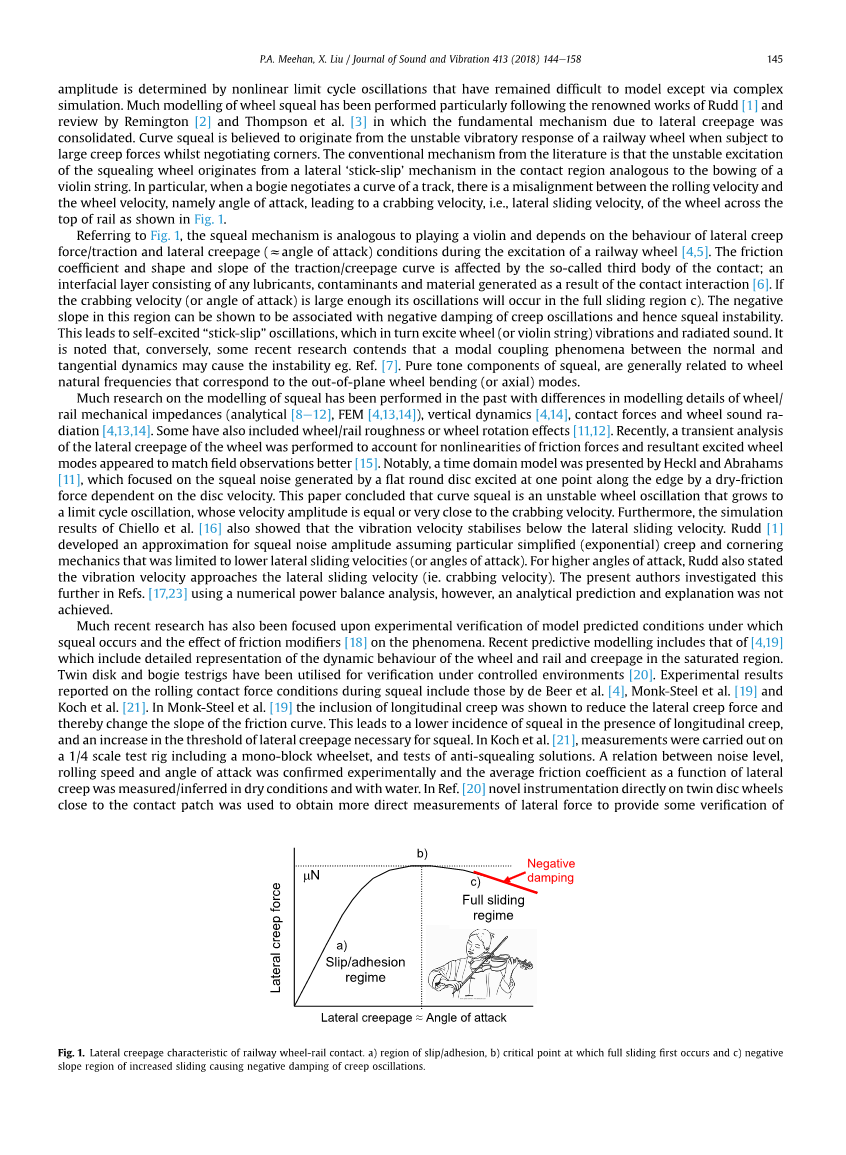 过去已经进行了关于啸叫建模的大量研究,其中轮/轨机械阻抗的建模细节(解析[8-12],有限元[4,13,14]),垂直动力学[4,14],接触力和车轮声辐射[4,13,14]。有些还包括轮/轨粗糙度或车轮旋转效应 [11,12] 。最近,为了解释摩擦力的非线性,进行了车轮偏航速度的瞬态分析,并且合成激励车轮模式似乎更好地匹配现场观测 [15] 。值得注意的是,Heckl和Abrahams提出了一个时域模型 [11] ,该模型主要研究由沿着边缘一点激发的平圆盘产生的尖叫噪声,该干涉摩擦力取决于盘片的速度。本文的结论是,曲线尖叫是一种不稳定的车轮振动,其增长到准周期振动,其速度振幅等于或非常接近极限速度。此外,Chiello等人的模拟结果.[16] 也表明振动速度稳定在横向滑动速度以下。 Rudd [1] 提出了一种啸叫噪声振幅的近似方法,假定特定的简化(指数)蠕变和转弯机制限于较低的横向滑动速度(或迎角)。对于更高的迎角,Rudd还表示振动速度接近侧向滑动速度(即捕捉速度)。本文作者在参考文献中进一步调查了这一点 [17,23] 使用数值功率平衡分析,然而,没有达到分析预测和解释。