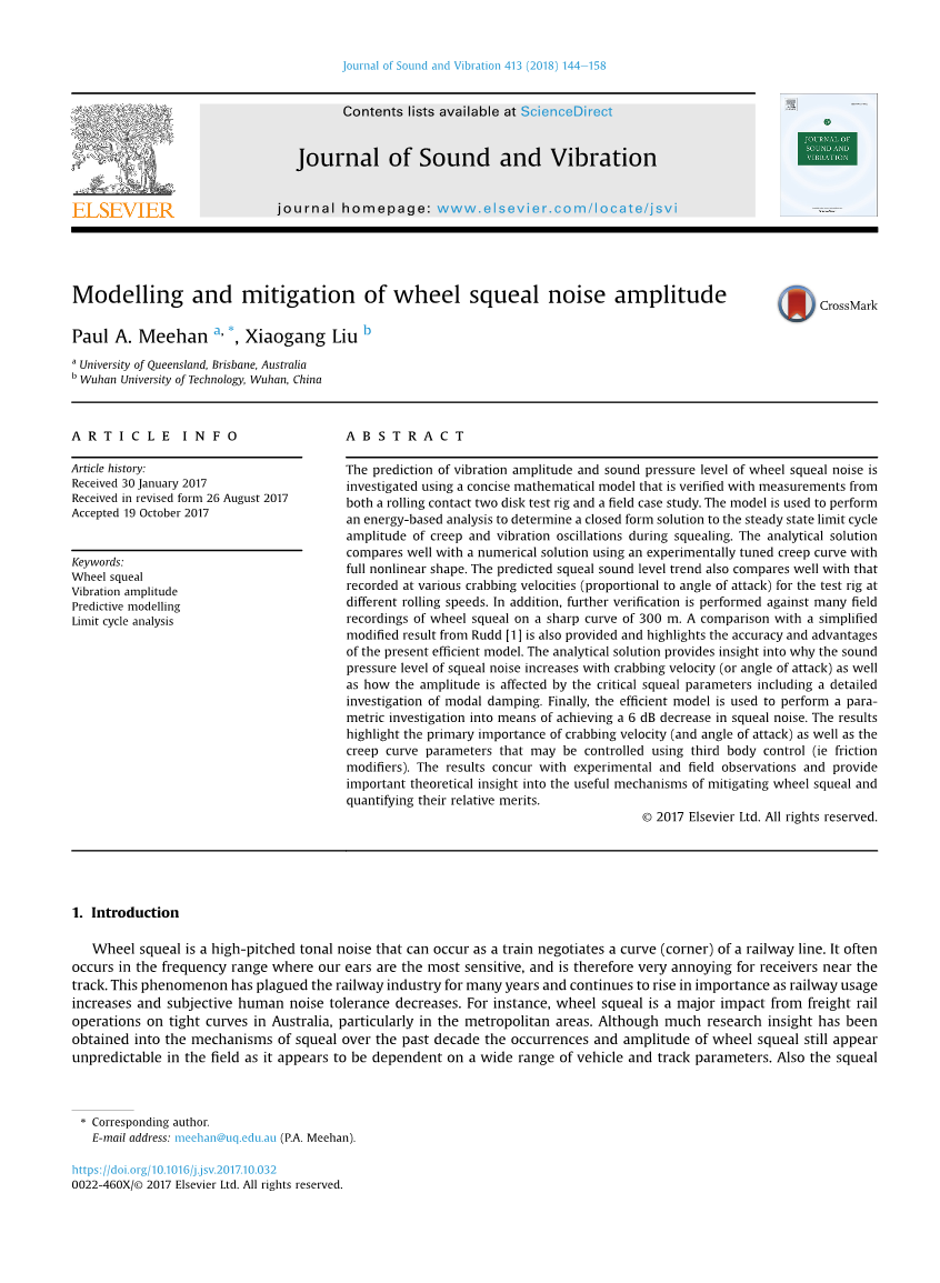 对于车轮啸叫噪声振幅和声压等级的预测是通过一个简明的数学模型展开的,这个数学模型已经在对双轮试验台和实际案例的测量研究中得到了验证。这个数学模型被用来进行一项基于能量的研究,从而针对车轮在啸叫过程中蠕滑和振动的稳态极限周期振幅确定一个闭环的解决方案。解析解与一个通过实验的方式调谐出的具有完全非线性形状的蠕滑曲线所得的数解具有高度的一致性。所预测的啸叫噪声声压等级也与在不同转速下、试验台记录下的不同爬行速度(正比于冲角大小)高度吻合。此外,利用一个300米的巨型曲线上关于啸叫噪声的实地记录数据也进行了一系列的证明工作。同时一个能够与经过拉德[1]简化和修改的实验结果相比较的结论也被提出,并且进一步突出了当前这个有效模型的准确性和优势。解析解内在地证实了为什么声压等级会随着爬行速度(或是冲角大小)的增大而增大,同时也说明了振幅是如何受到临界啸叫参数影响的,其中包括一个对于模态阻尼细致的调查。最后,这个有效的模型也被用于一个标准参数化的研究,去探寻使啸叫噪声能够降低6分贝的具体措施。这个结果强调了爬行速度(或是冲角大小)和蠕滑曲线上那些可以由第三方装置控制(即摩擦调节器)的参数最根本的重要性。这个结果与实验和实际观测都十分契合,并且为一个能够有效减弱啸叫噪声机械装置的研究提供了十分重要的理论依据,并且能够进一步提升这些装置的优点。