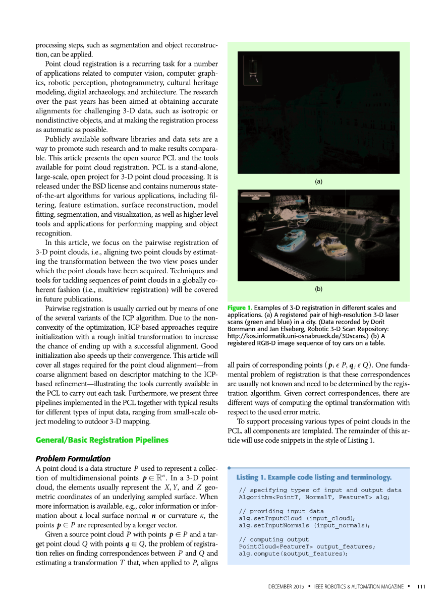数据(和应用程序)以及PCL中的相应注册流水线。这些例子包括由消费者的彩色和深度相机采集的密集的红绿蓝深度(RGB-D)点云,来自商用3-D扫描仪的高分辨率激光扫描以及由定制轻量级捕获的低分辨率稀疏点云微型汽车(MAV)上的三维扫描仪。