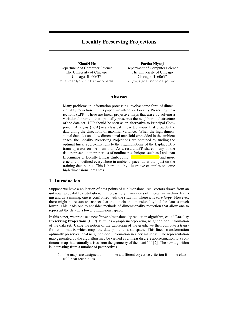 信息处理中的许多问题都涉及到某种形式的降维。在这篇论文中,我们介绍局部保持投影(LPP)。这些都是通过解决一个变分问题,从而最优地保留了数据集的邻域结构的线性投影图。LPP应该被看作是主成分分析(PCA)的替代。(PCA:一种经典的线性技术,它根据最大方差的方向投影数据) 当高维数据嵌入环绕空间内的低维流形时,通过对流形上的拉普拉斯-贝尔特米算子的特征函数求出最优线性逼近,得到局部保持投影。因此,LPP具有许多诸如拉普拉斯特征映射、局部线性嵌入等非线性技术的数据表示特性。然而LPP是线性的,更重要的是定义在整个环绕空间,而不仅仅在训练数据点上。这是通过一些高维数据集的例子来证明的。