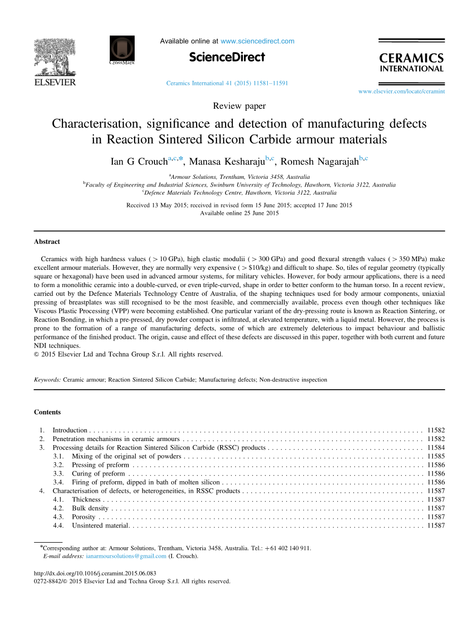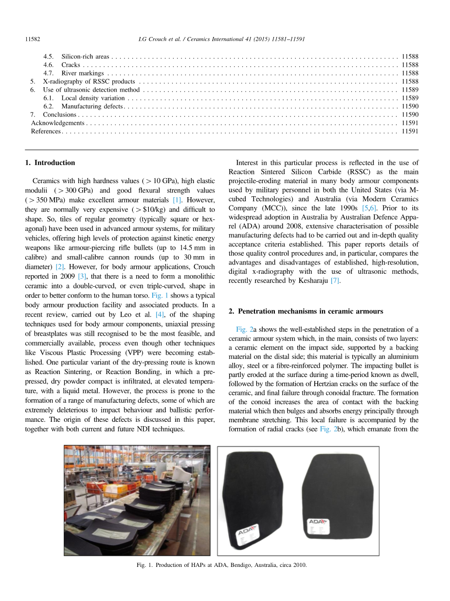 对此特定进程的兴趣反映在,自二十世纪90年代后期[5,6]起,反应烧结碳化硅 (RSSC) 在美国 (通过 Mcubed 技术) 和澳大利亚 (通过现代陶瓷公司 (MCC)) 作为主要弹丸侵蚀材料使用于许多人体装甲部件中。该材料在2008年左右在澳大利亚被澳大利亚国防服装公司(ADA)广泛采用之前,必须对可能的制造缺陷进行广泛的描述,并建立深入的质量验收标准。本文报道了这些质量控制程序的细节,特别是比较了最近由Kesharaju [7]研究的使用超声波方法建立的高分辨率数字X射线照相术的优缺点。