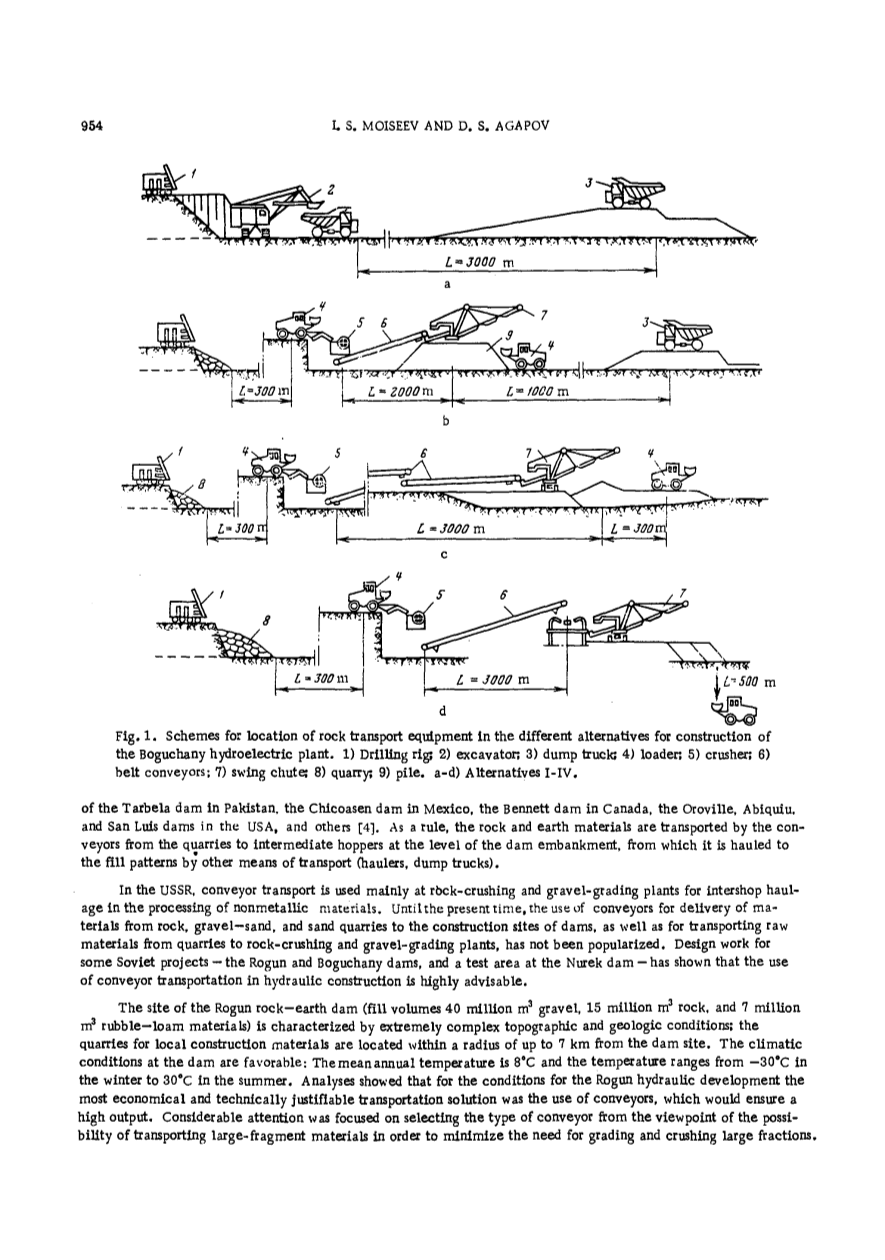 在苏联电力和电气化部(Mindnergo)下辖的五座最具代表性的非金属材料采石场中的土石方工程中每个企业的总计达到150-250万mS /年。从采石场到堤坝的土石料运输距离范围通常在3-5公里,并且岩石到处理它的浓缩设备的运输距离大约为2公里。目前取决于堤坝建设的土石方以及非金属材料。采石场采用自卸卡车运输,运载能力高达27吨,运输成本为12-15戈比/吨。这使得有必要建设和维护昂贵的道路,特别是硬质路面,大容量机器,以及维修机械车间,加油站,燃油库等服务企业的建设和维护。因为卡车运输需要大量的工人,特别是司机,同时增加了住宅和企业的建设人员。