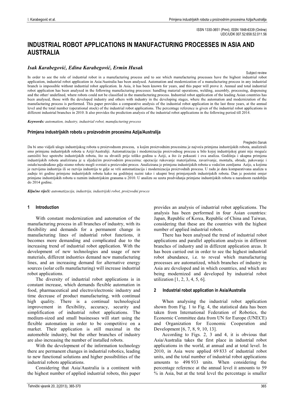 [15] Karabegović, I.; Doleček, V.; Jurković, M. Application of Industrial robots in small and medium sized enterprises. // 1st International Scientific Conference on Engineering MAT 2010, Mostar 18-20. November, pp. 1-7. <!--