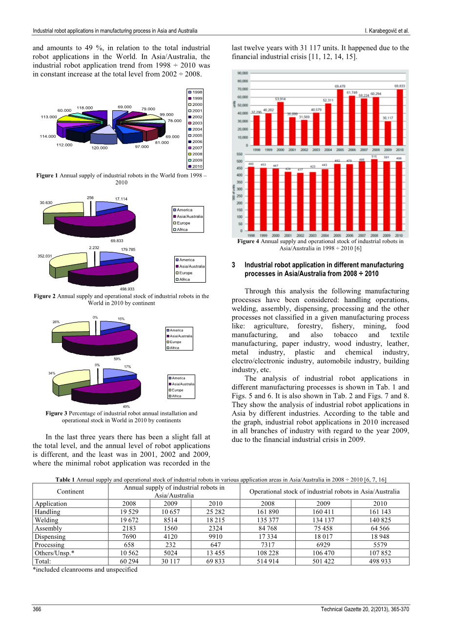 图1、图5和图6以及表2和图7和图8说明了工业机器人在不同制造过程中的应用。我们对不同行业的工业机器人应用进行了分析。根据表格和图表,工业机器人在2010年的应用数量全线增加,这是由于2009年的金融产业危机。