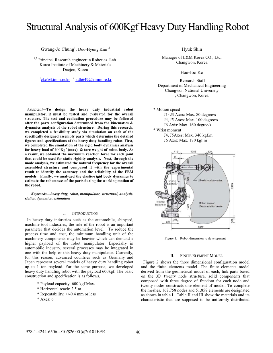 摘要:设计重型工业机器人操纵器,它必须进行测试和评估整体结构体。在根据运动学确定的部件配置和机器人结构的动力学分析后,进行测试和评估程序。在这项研究中,我们通过对每一种模拟进行了可行性研究,通过专门设计的组装部件确定详细的重型搬运机器人的数字和规格。第一,我们对600Kgf(最大)的重载和机器人的体重,完成了刚体动力学分析的模拟。结果,我们获得了每个关节可用于静态刚度分析的最大反作用力。接下来,通过模式分析,我们估计整体的固有频率并将其与实验结果进行比较去识别FEM的准确性和靠性模型。最后,我们分析了弹性 - 刚体动力学去估算零件在工作运动中机器人的稳健性。
