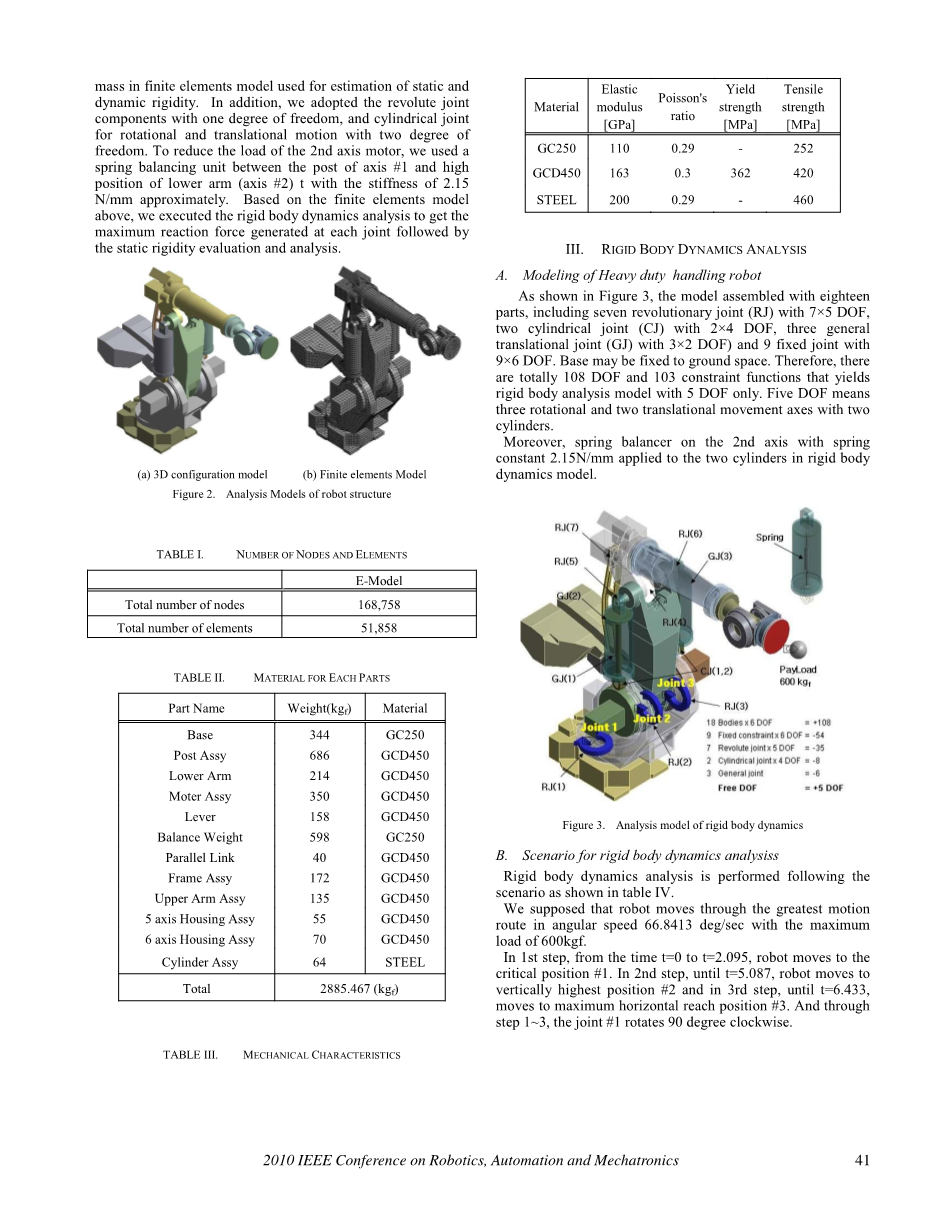 图2显示了三维配置模型和有限元模型。有限元模型从每个链接部分的几何模型导出,基于在3D二十节点结构固体组件上由每个节点和三个自由度组成二十个节点构成模型的一个元素。要完成网格,需要168,758个节点和51,858个元素被指定如表I所示。表II和III显示了这些材料及其特性应该是均匀分布,0mass在有限元模型中用于静态和动态估计动态刚性。另外,我们采用的转关节是具有一个自由度的部件和圆柱形接头,用于两度的旋转和平移运动自由。为了减少第二轴电机的负载,在轴#1和高轴之间下臂(轴#2)t的位置我们使用了一个弹簧平衡单元,刚度为2.15N / mm左右。基于以上有限元模型,在对静态刚度评估和分析后,我们执行了刚体动力学分析,得到了在每个接合处产生的最大反作用力。