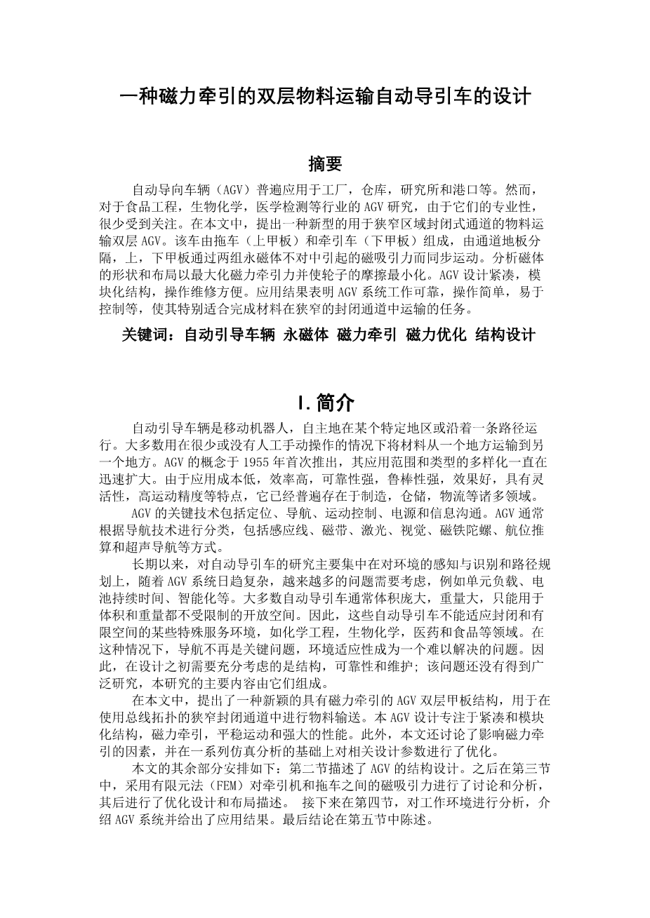 AGV小车结构设计外文翻译资料 2022-05-27 22:42:00 英语原文共 6 页,剩余内容已隐藏,支付完成后下载完整资料 英语原文共 9 页,剩余内容已隐藏,支付完成后下载完整资料资料编号:[11684],资料为PDF文档或Word文档,PDF文档可免费转换为Word 原文和译文剩余内容已隐藏,您需要先支付 30元 才能查看原文和译文全部内容!立即支付 发小红书推广免费获取该资料资格。点击链接进入获取推广文案即可: Ai一键组稿 | 降AI率 | 降重复率 | 论文一键排版 PREVIOUS NEXT 您可能感兴趣的文章 流化床包衣造粒过程的监测与控制研究外文翻译资料 一种新颖的旋转流化床包衣细颗粒涂层的方法外文翻译资料 中国城市垃圾的处理和管理外文翻译资料 滤袋、气旋、和湿式除尘方法在真空吸尘器中的比较外文翻译资料 一个灵活的模型辗环机设计外文翻译资料 带有柔性转子的主动电磁轴承系统的识别外文翻译资料 柔性阻尼支承下转子振动特性实验外文翻译资料 MapReduce:超大集群上的数据简化处理外文翻译资料 垂直循环式立体车库的停车与乘车调度优化外文翻译资料 高灵敏度、高稳定性的自温度补偿电涡流位移传感器外文翻译资料