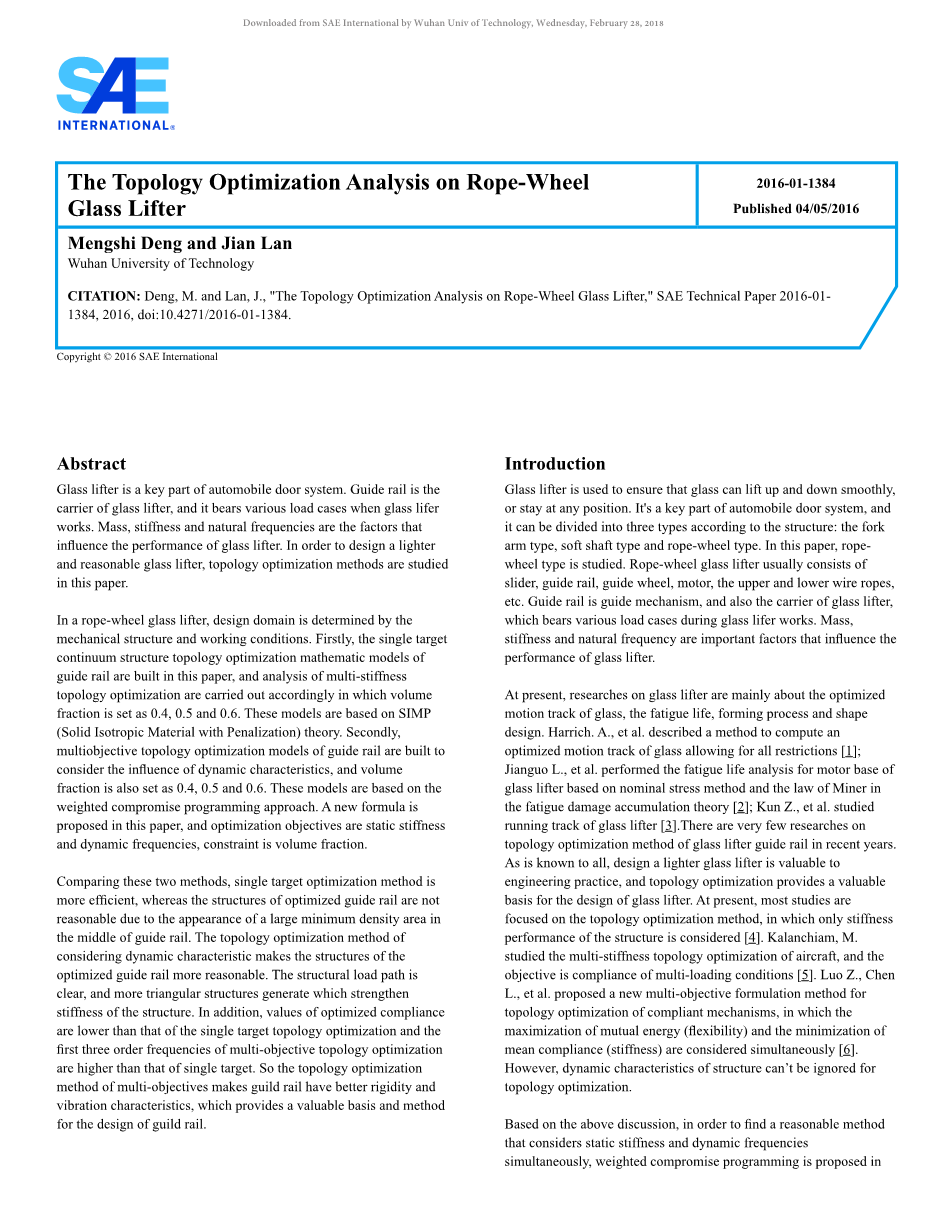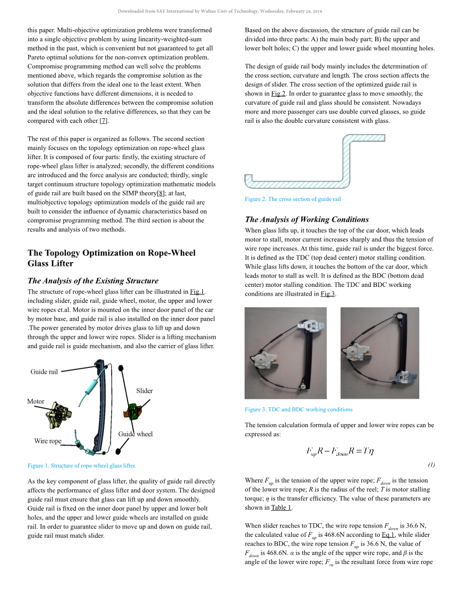 玻璃升降器是汽车门系统的关键部分。导轨是玻璃升降器的载体,当升降器工作时它承载着各种载荷情况。质量、刚度和固有频率影响着玻璃升降器的性能。为了设计一个更轻的、合理的玻璃升降器,本文运用拓扑优化方法进行分析。