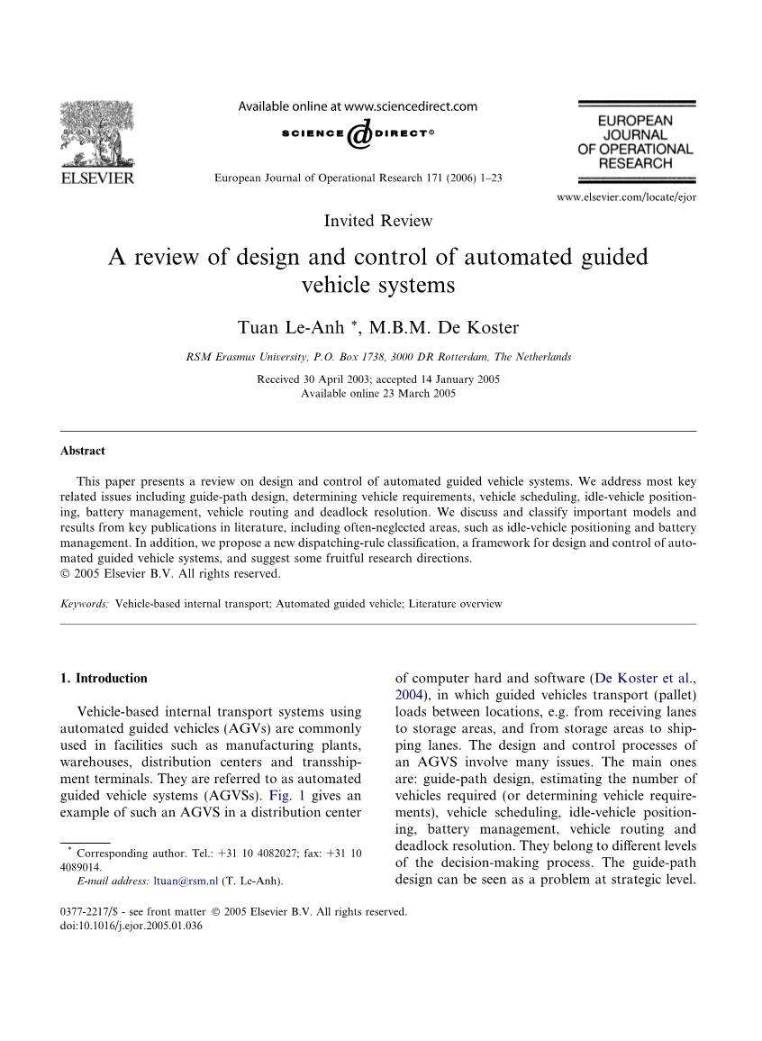 这篇文章文章介绍了有关AGV小车系统控制和设计的评述。我们解决了很多要点问题包括:路径导航,车辆需求确定、车辆调度、怠速车辆定位等,电池管理、车辆路由和死锁解决。我们从主要出版物文献中讨论和分类重要的模型和结论,包括经常被忽视的领域,如闲置车辆定位和电池的结果管理。此外,我们提出了一个新的调度规则分类,一个自动化的设计和控制框架指导车辆系统,并提出一些富有成效的研究方向。
