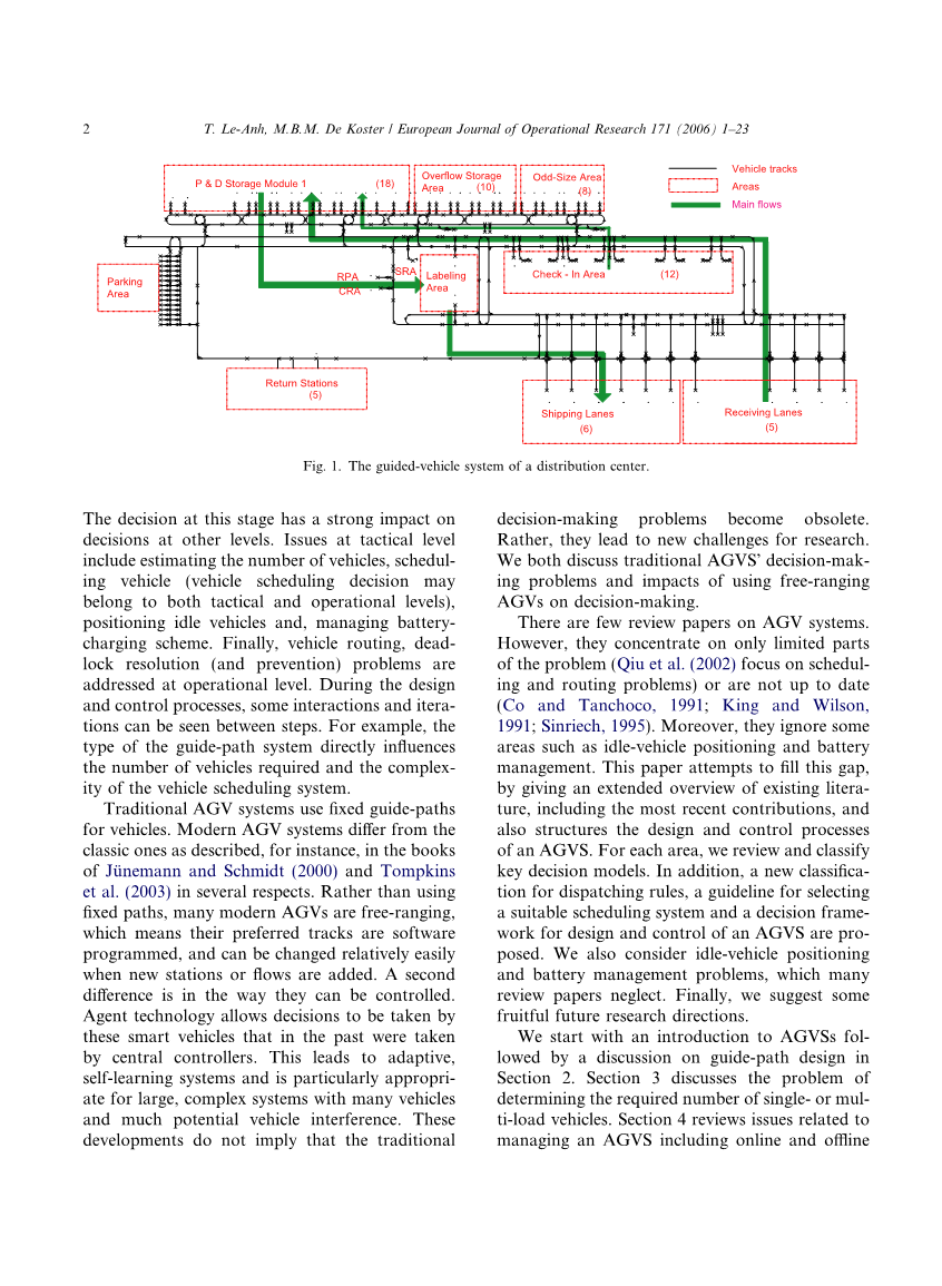 基于车辆的内部运输系统使用自动导引车(AGV)常用于制造工厂等设施,仓库、配送中心和转运终端。它们被称为自动化引导车辆系统(AGVSs)。图1给出了配送中心的计算机硬件和软件中的AGS的例子(De Koster et al.,2004),在这当中AGV小车装载地点比如说从输送线路到存储线路,再从存储线路到运输线路。AGVs的设计和控制过程存在很多问题。其中主要的问题有导轨设计,估计数所需车辆(或确定车辆要求),车辆调度,怠速车辆定位,电池管理,车辆路由和死锁的处理。它们属于不同的级别决策过程。引导路径设计可以看作是在战略层面上一个问题。