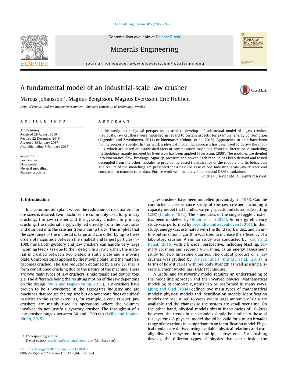 摘要:在这项研究中,我们运用分析视角来建立颚式破碎机的基本模型。以前对颚式破碎机的建模是针对特定角度的,例如能源消耗(引用自Legendre和Zevenhoven2014年的文章)或运动学(引用自Oduori等人2015年的文章)。迄今为止,主要是用于地产方面。在这项工作中,物理建模方法已经被用于模块推导,这些模块是基于文献中提及的粉碎机实地使用经验得到的。主要受Evertsson启发而得的建模方法已被应用(引用自Evertsson2000年的文章)。模块分为运动学、流量、破损、容量、压力和功率等方面。每个模块都与其他模块分离开来进行测试,以更透彻地了解模块及其运行模式。建模结果呈现的是一台工业规模的颚式破碎机的基线情况,以及会呈现与制造商数据进行比较的结果。未来还将进行验证和DEM模拟。