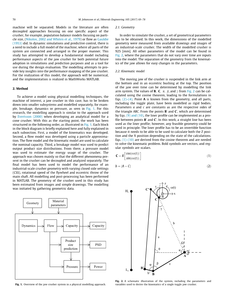 颚式破碎机早已建;1953年,Gauldie对颚式破碎机进行了性能研究,其中包括变速处理和封闭式设置(CSS)的能力模型(引用自Gauldie1953年的文章)。 Oduori等人于2015年对单肘式破碎机的运动进行了模拟。 Legendre和Zevenhoven于2014年进行了一项能效研究。在他们的研究中,用Bond工作指数估算能量,并且使用在线优化算法来提高实验室破碎机的效率。Tosun和Konak于2015年对两个石灰石采石场的能源评估进行了类似的研究,并且其视角更广,包括爆破,初级破碎和二次破碎。Olaleye(2010年)和Mu(2013年)等人研究了颚式破碎机的输出产品,研究其变化与矿体强度以及离散元素建模(DEM)技术使用的变化之间的关系。