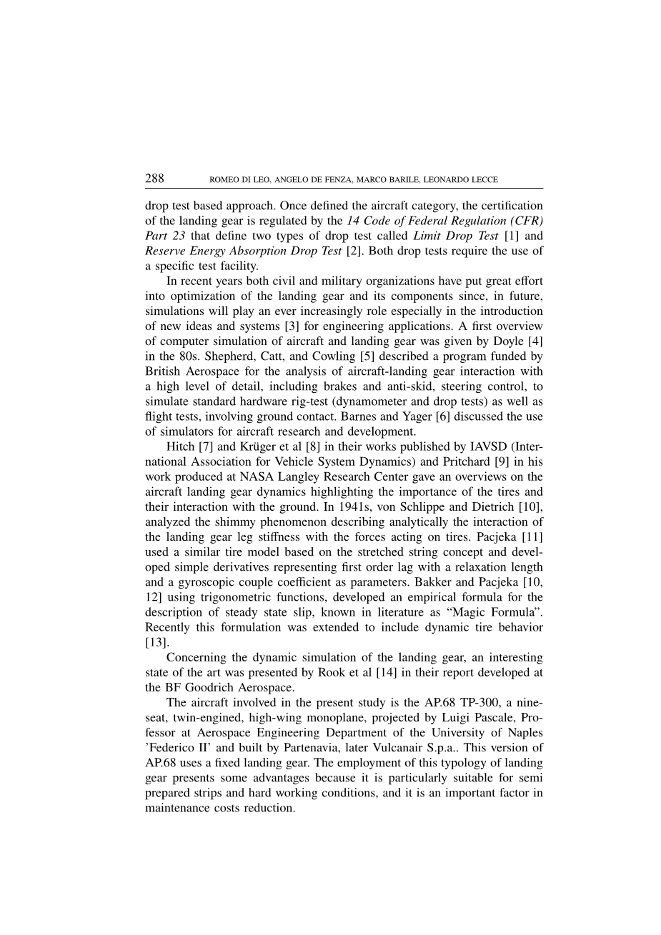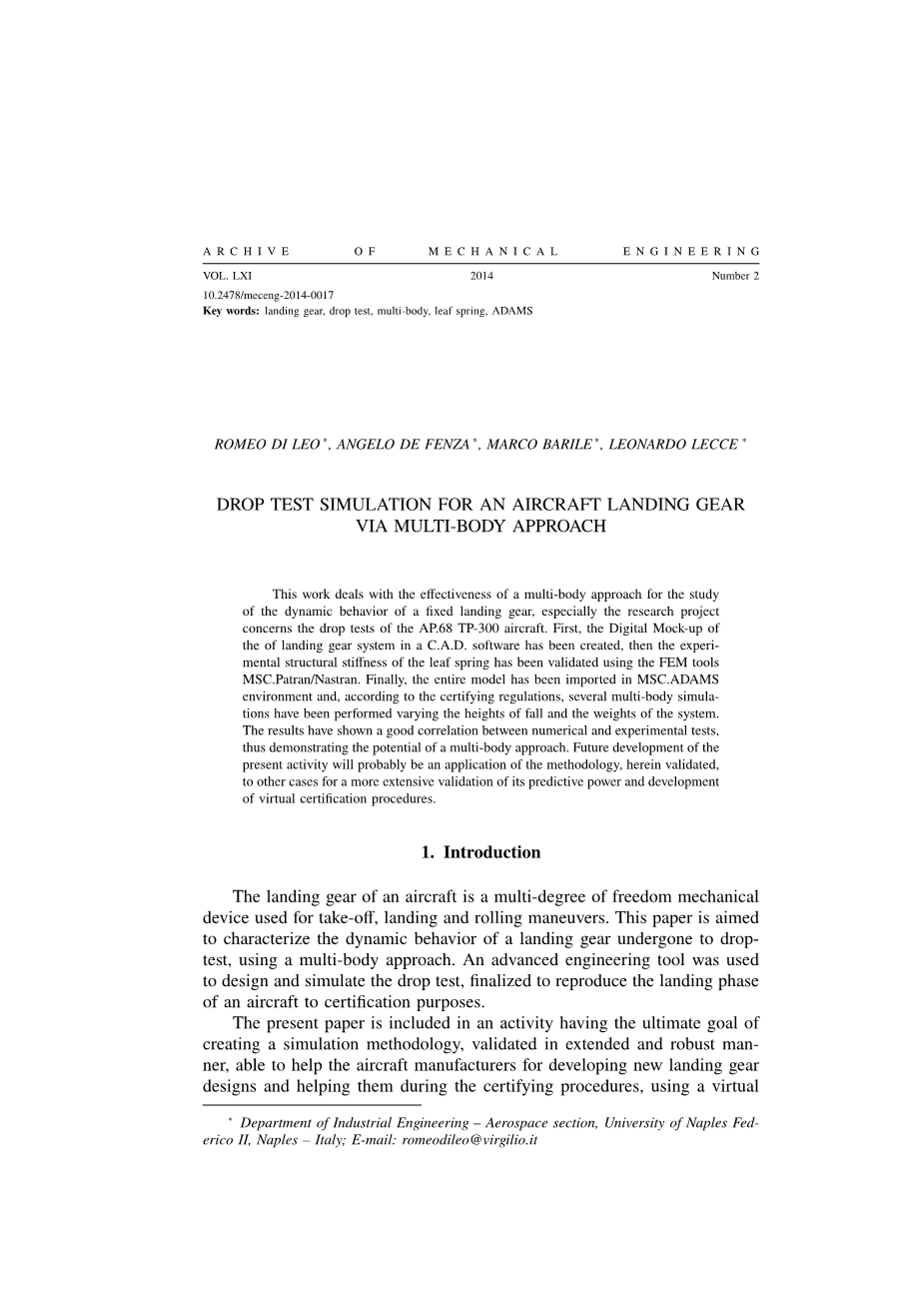 本研究探讨了一种多体方法对固定起落架的动态特性研究的有效性,特别是研究项目涉及到了AP.68 TP-300型飞机的跌落试验。首先,在C.A.D.软件中建立了一个起落架系统的数字模型,然后用有限元分析工具MSC.Patran/Nastran对叶片弹簧的实验结构刚度进行了验证。最后,整个模型已经导入MSC.ADAMS环境,根据认证规定,已经进行了多个改变了坠落的高度和系统的重量的多体仿真。结果表明,数值实验与实验结果具有良好的相关性,证明了多体方法的可行性。当前研究的未来发展很可能是该方法的一种应用,在此基础上,对其他情况进行验证,以便对其预测能力和虚拟认证程序的开发进行更广泛的验证。
