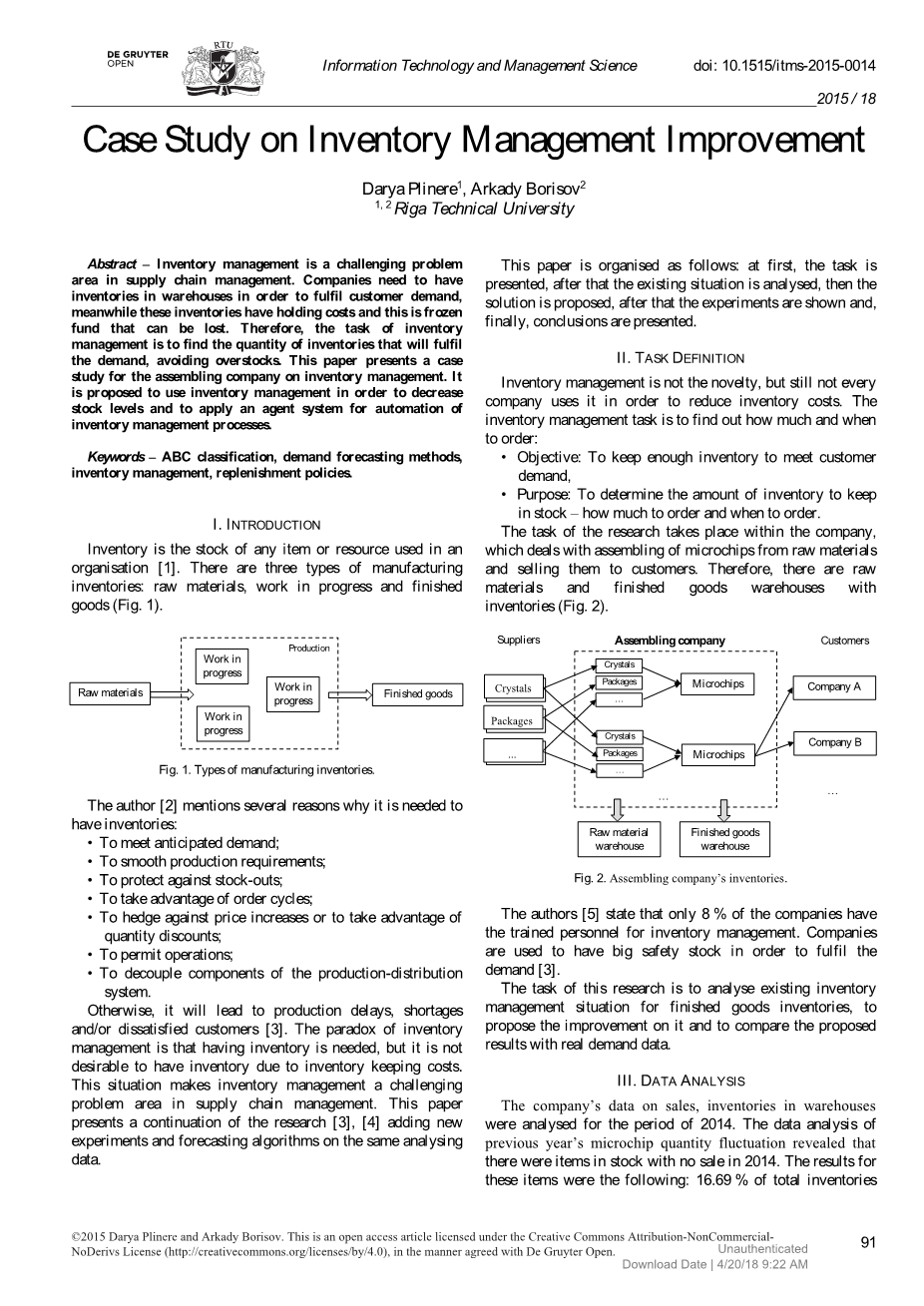 库存管理是供应链管理中一个具有挑战性的问题领域。为了满足客户的需求,公司需要在仓库里有库存,同时这些库存需要成本,这也是可以损失的冻结资金。因此,库存管理的任务是找到满足需求的库存数量,避免库存过剩。本文展示了一种库存管理装配公司的案例研究。根据研究成果可得出以下结论:使用库存管理来改变库存能力,并应用一个代理系统来实现库存管理过程的自动化。
