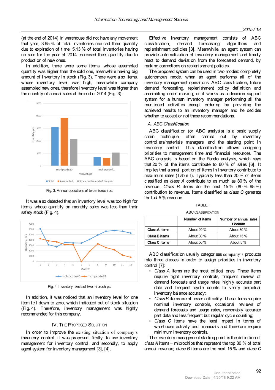 本文介绍了目前正在进行的AEMAS(装配企业多代理系统)的研究;因此,它与库存管理代理相关[3],[4]。库存管理代理的功能之一是决定何时以及如何组装芯片。它具有可能的最小储量的信息——安全库存、未来需求预测算法和生产能力。库存管理代理有以下行为:ABC分类算法,未来需求预测算法和补货政策,以避免库存情况,同时降低库存水平和持有成本。