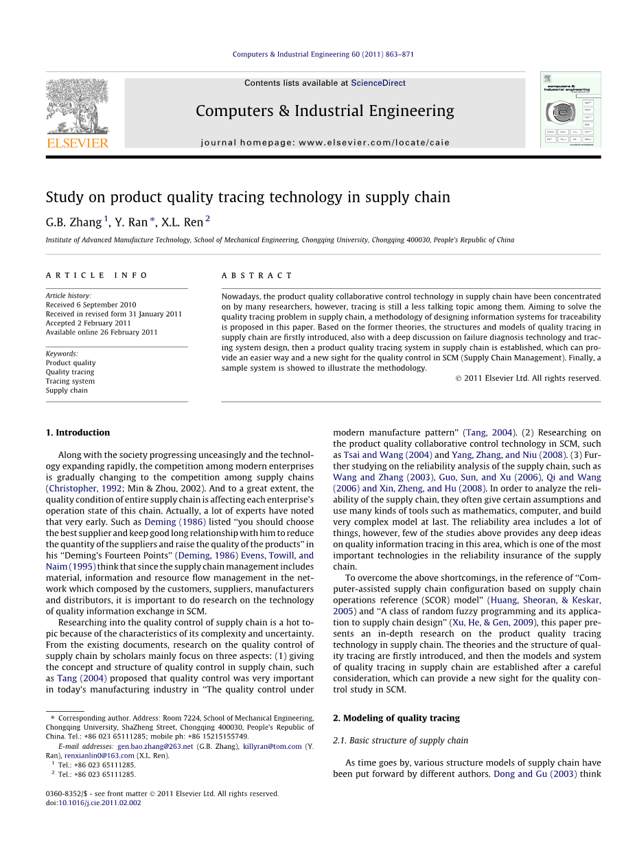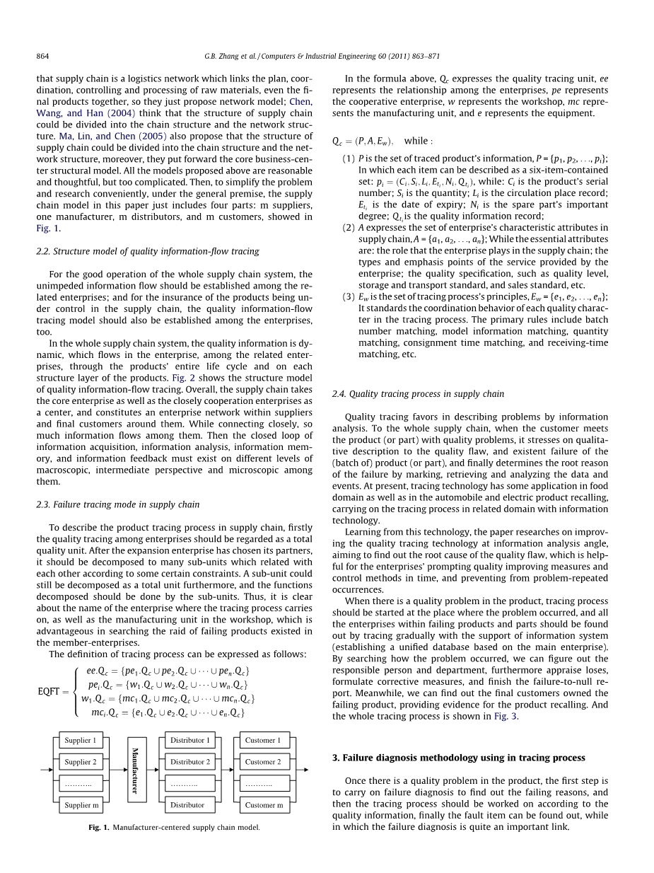 由于其复杂性和不确定性的特点,研究供应链质量控制是一个热门话题。从现有文献看,学者对供应链质量控制的研究主要集中在三个方面:(1)给出了供应链质量控制的概念和结构,如Tang(2004)提出,质量控制是非常重要的今天的制造业在“现代制造模式下的质量控制”(唐,2004)。(2)研究供应链管理中的产品质量协同控制技术,如蔡和王(2004)和杨,张,牛(2008)。(3)进一步研究供应链的可靠性分析王和张(2003),郭,孙和许(2006),齐和王(2006)以及辛,郑和胡(2008)。为了分析供应链的可靠性,他们经常给出一定的假设,并使用数学,计算机等多种工具,最终建立非常复杂的模型。可靠性领域包括很多事情,然而,上述研究很少提供关于该领域质量信息追踪的深层思想,这是供应链可靠性保险中最重要的技术之一。
