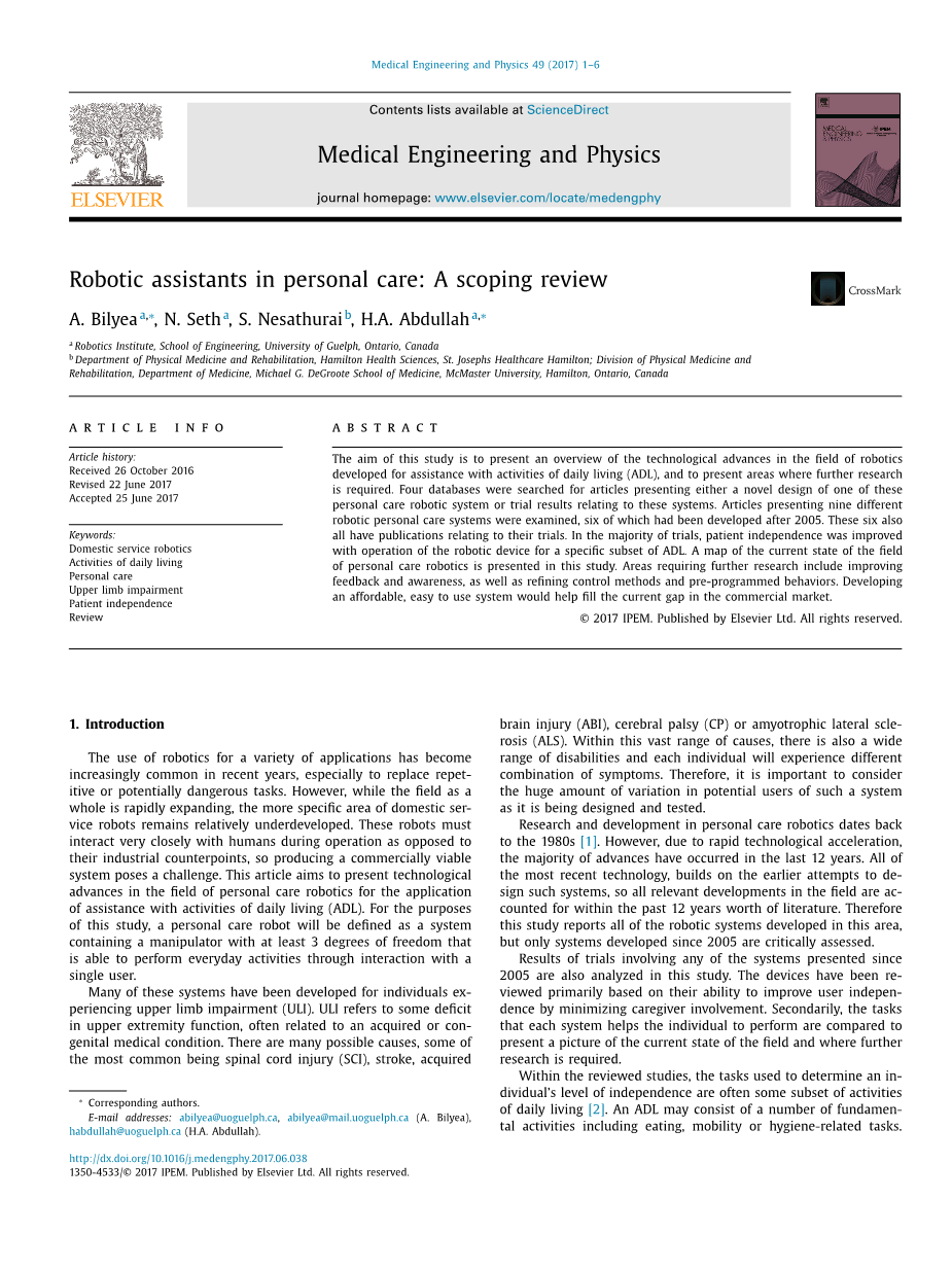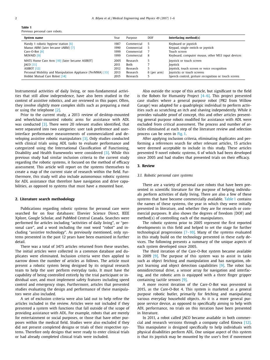 在四个数据库上搜索的关于机器人系统个人护理的出版物如下:Elsevier Science Direct,IEEE Xplore,Google Scholar和PubMed Central Canada。针对包括“日常生活活动”或“个人护理”的文章以及包括词根“机器人”和包括“辅助技术”的文字进行检索。如前所述,过去12年提出的系统已经被进一步详细审查。