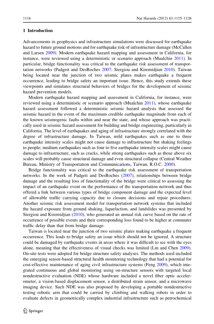 我们已经讨论过地球物理和基础设施模拟在地震对未来地面运动的危害和基础设施地震危险性方面的进展(McCallen and Larsen 2009)。例如,在加利福尼亚州现代地震灾害测绘评估中,使用了确定性或情景方法进行检测(Mualchin 2011)。需要特别注意的是,桥梁功能对运输网络的地震风险评估至关重要(Padgett 和 DesRoches 2007; Stergiou 和 Kiremidjian 2010)。位于两块地震板交界处附近的中国台湾地震频发,导致桥梁安全成为一个重要问题。因此,本研究扩展了这些观点并模拟了桥梁的结构行为,以开发地震危险预防模型。