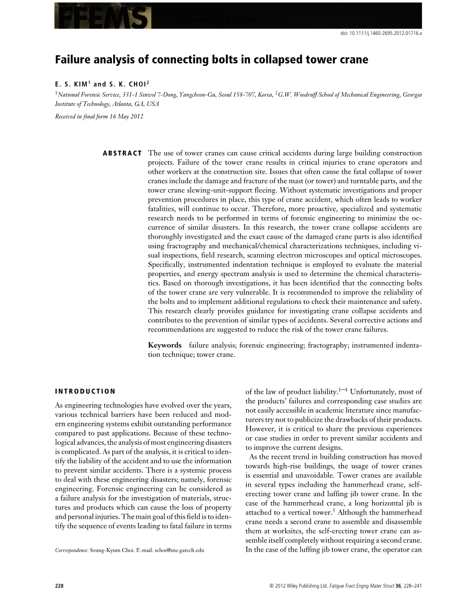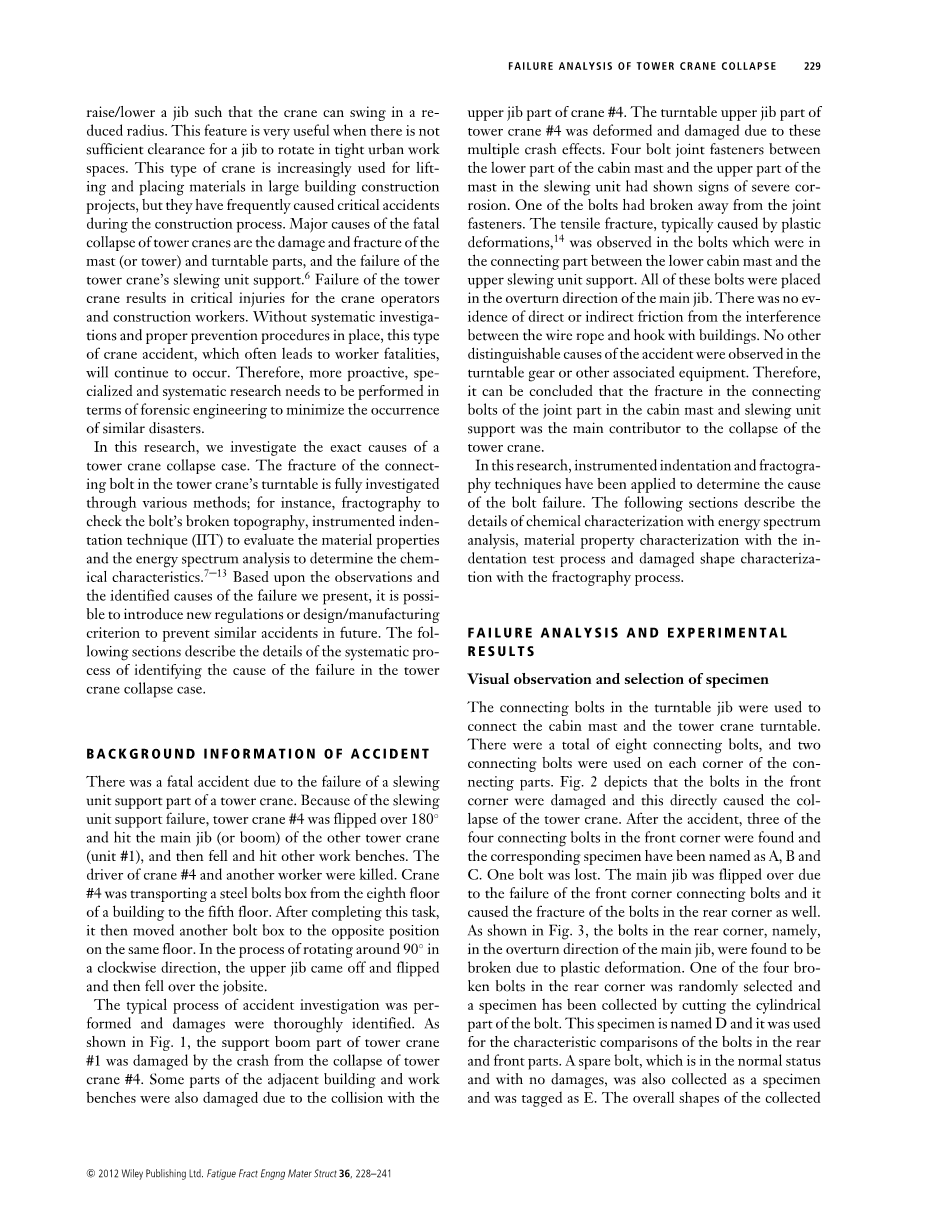 在这项研究中,我们调查了塔式起重机倒塌情况的确切原因。通过各种方法充分研究了塔式起重机转台连接螺栓的断裂问题,例如用于检查螺栓断裂形貌的断层成像技术,用于测量材料特性的仪器化压痕技术(IIT)以及用于确定化学特征的能谱分析。根据观察结果和我们提出的失效原因,有可能引入新的法规或设计/制造以防止今后发生类似事故。 以下部分描述了识别塔式起重机倒塌失效原因的系统过程的细节。