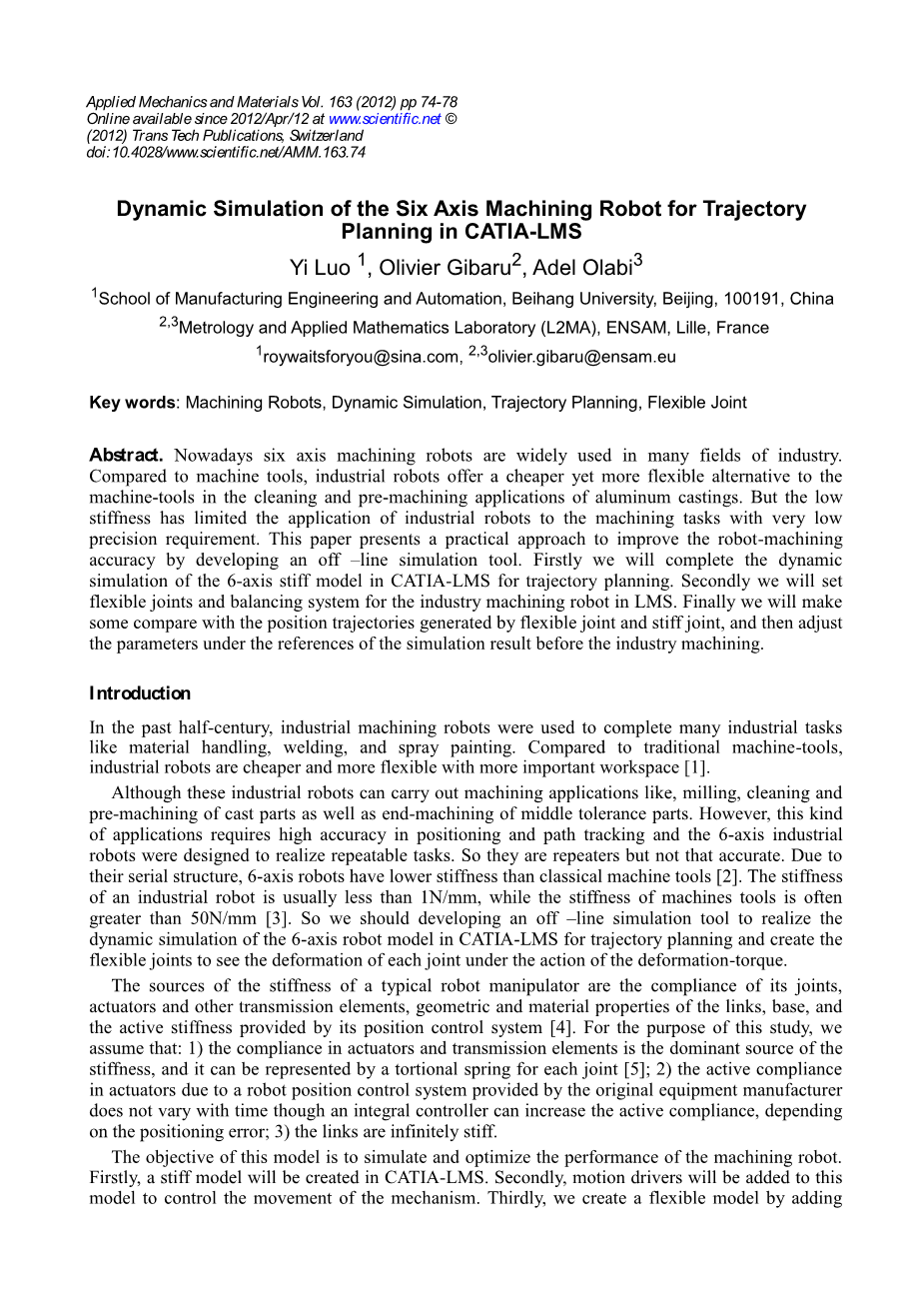 摘要。目前六轴加工机器人在工业领域得到了广泛的应用。与机床相比,工业机器人提供了一种比机床更便宜、更灵活的选择。铝铸件的清洗及预加工应用。但是由于刚度低,使得工业机器人在加工精度要求很低的加工任务中的应用受到了限制。本文提出了一种通过开发离线仿真工具来提高机器人加工精度的实用方法。首先,我们将完成六轴刚性模型的动态仿真。在CATIA-LMS中用于轨迹规划。其次,在LMS中为工业加工机器人设置柔性关节和平衡系统。最后,我们将与位置轨迹做一些比较。由柔性关节和刚性节点生成,在工业加工前,根据仿真结果调整参数。
