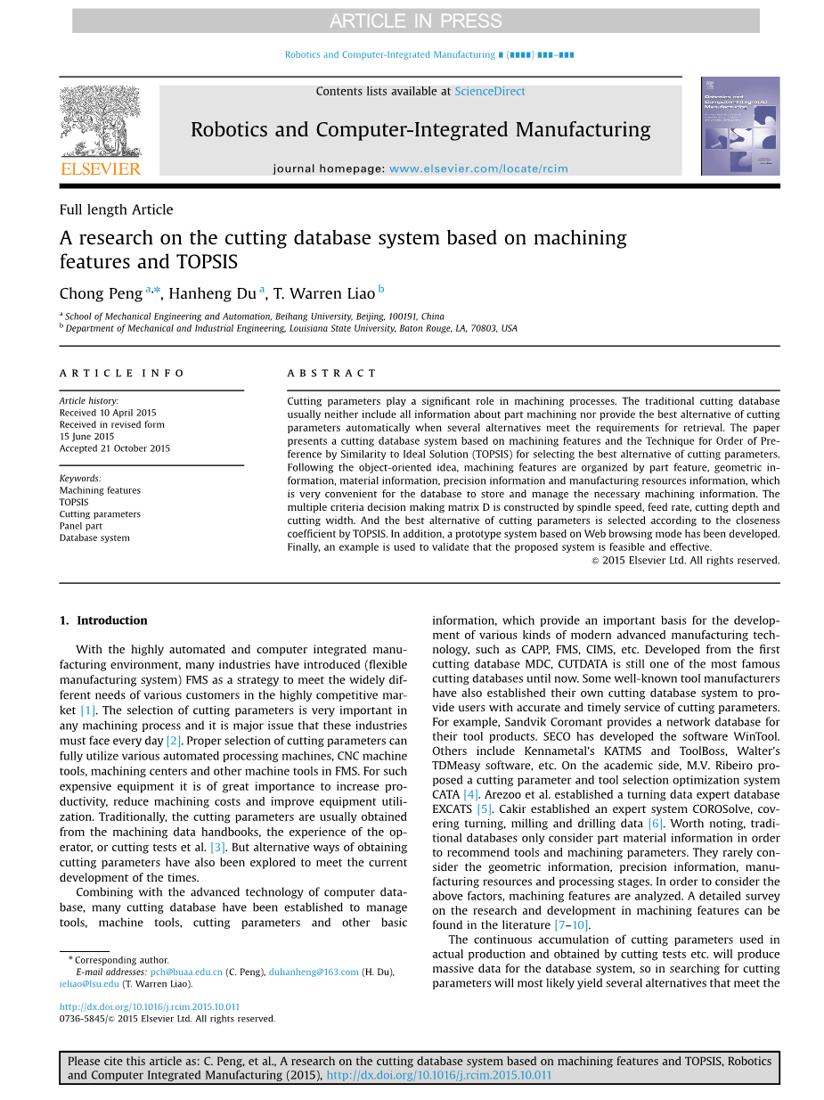 摘 要:切削参数在加工过程中起着重要的作用。传统的切割数据库通常既不包含关于零件加工的所有信息,也不提供切割参数的最佳替代方案,当多种替代方案满足检索要求时。本文提出了一种基于加工特征的切削数据库系统和用于选择最佳切削参数选择的相似理想解决方案(TOPSIS)技术。按照面向对象的思想,加工特征按零件特征,几何信息,材料信息,精密信息和制造资源信息组织起来,非常方便数据库存储和管理必要的加工信息。多标准决策矩阵D由主轴转速,进给速率,切削深度和切削宽度构成。根据TOPSIS的贴近度系数选择切割参数的最佳替代方案。此外,还开发了基于Web浏览模式的原型系统。最后,用一个例子来验证所提出的系统是可行和有效的。
