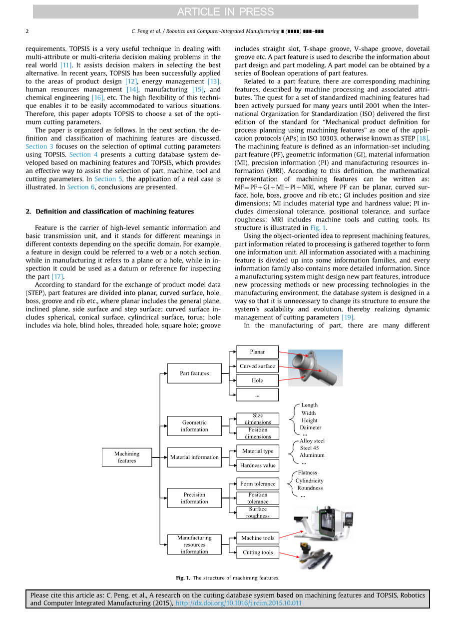 本文的结构如下。在下一节中,将讨论加工特征的定义和分类。第3节着重于使用TOPSIS选择最佳切割参数。第4节介绍了基于加工特征和TOPSIS开发的切削数据库系统,该系统提供了一种有效的方法来帮助选择零件、机床、刀具和切削参数。在第5节说明了一个真实案例的应用。在第6节,提出结论。