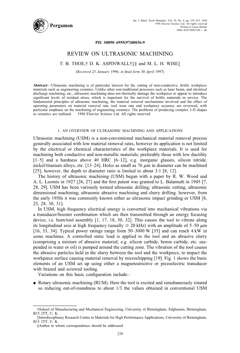 超声波加工(USM)的历史始于 1927 年 RW Wood 和 AL Loomis 的论文[26, 27]1945 年第一项专利授予 L. Balamuth[7, 28, 29]。