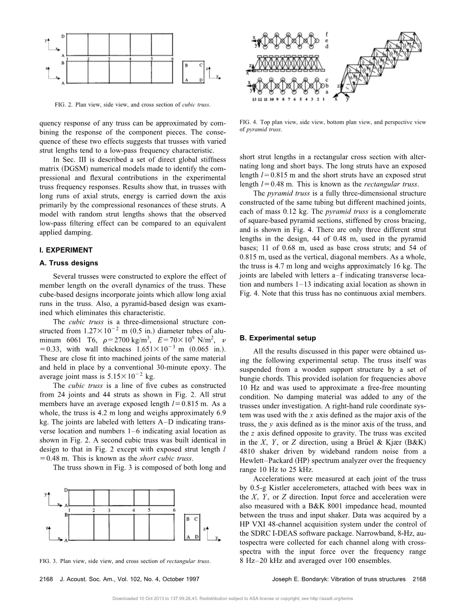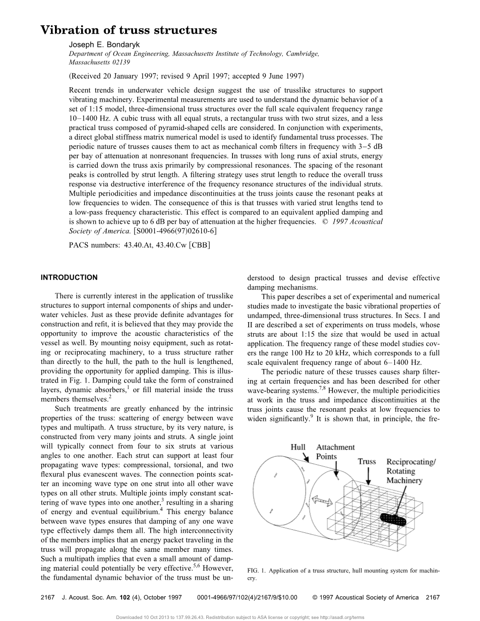 10 - 1400HZ。本文主要涉及了支杆全都相同的立方桁架,具有两个支杆尺寸的矩形桁架,以及实际较少用到的由金字塔型为最小单元体组成桁架。在相互连接的实验中我们运用一个直接整体刚度矩阵数值模型来识别基本桁架结构。桁架的周期性使得它们充当在非共振频率上每次振动衰减3~5dB的机械梳状滤波器。在长轴支杆的桁架中,能量传递到桁架轴主要是通过压缩共振的。谐振间隔峰值由支撑长度控制。有一种滤波方案是运用控制桁架支杆的长度通过单个支杆共振结构的干涉相互抵消来减少整体桁架的振动。桁架节点的多周期性和阻抗不连续性使得其使低频共振峰加宽从而导致了具有不同支杆长度的桁架趋向于低通频率特性。这种效果是等效的应用阻尼,并被证实其在高频率下达到每千dB衰减6dB。